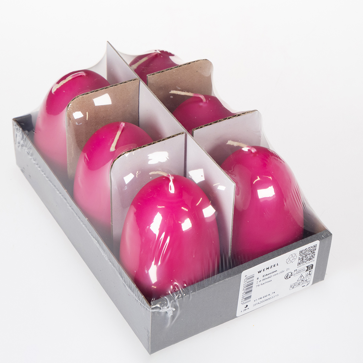 Detta rosa äggljus kombinerar fräscha färgaccenter med högkvalitativt hantverk. Med en höjd på 9 centimeter och en diameter på 6 centimeter är det den perfekta mittpunkten för en vårdukning. Dess varma sken skapar en naturlig och mysig atmosfär utan att vara överväldigande. Trots sin livfulla färg är ljuset inte helt genomfärgat. Den subtila glansen på ytan ger det en modern elegans som kompletterar nästan alla inredningsstilar. Oavsett om du föredrar en minimalistisk skandinavisk look eller något mer lekfullt, ger detta rosa äggljus en färgklick utan att offra tidlösheten. För en särskilt harmonisk look, kombinera ljuset med pastellfärgade servetter, färska blommor som hyacinter eller små påskfigurer. Tips: Vårt äggljus passar också vackert ihop med silverfärgade eller vita dekorativa element, vilket ger en touch av fräschör till enklare arrangemang. En särskilt praktisk funktion: paketet innehåller sex ljus, vilket gör även större dekorationer till en barnlek!