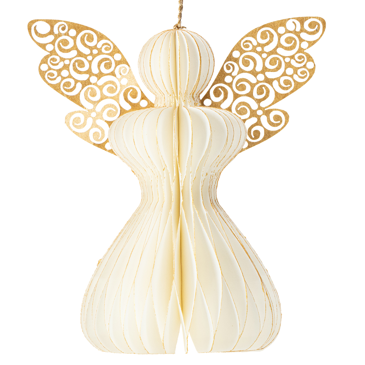 Dessa ängelprydnader i papper ger ditt hem en elegant touch. Med sin vita och guldfärgade design kommer dessa ängelhängen garanterat att glädja. De fina vingarna, kärleksfullt tillverkade med gyllene utsmyckningar, ser både eleganta och luftiga ut. Denna ängel är inte bara ett vackert blickfång utan också otroligt praktisk. Vikbar och utrustad med magnetisk stängning kan den enkelt förvaras. Perfekt för alla som vill spara plats! Oavsett om den är i julgranen, i fönstret eller som bordsdekoration – denna ängel ser fantastisk ut var som helst.