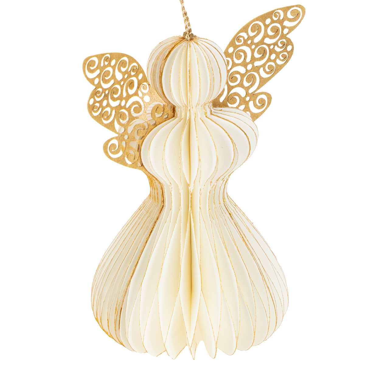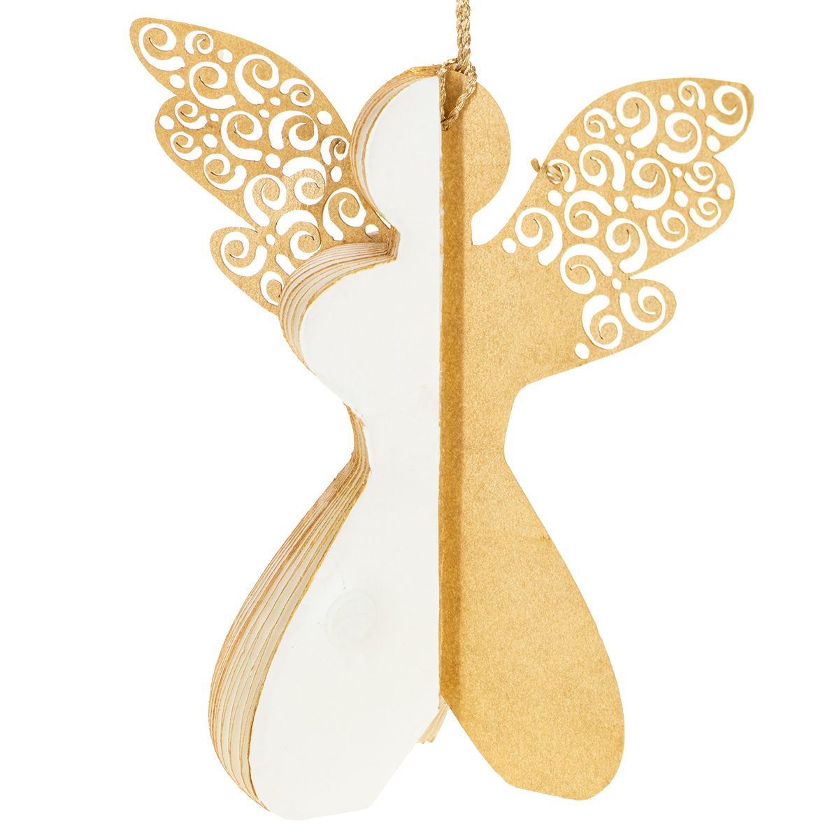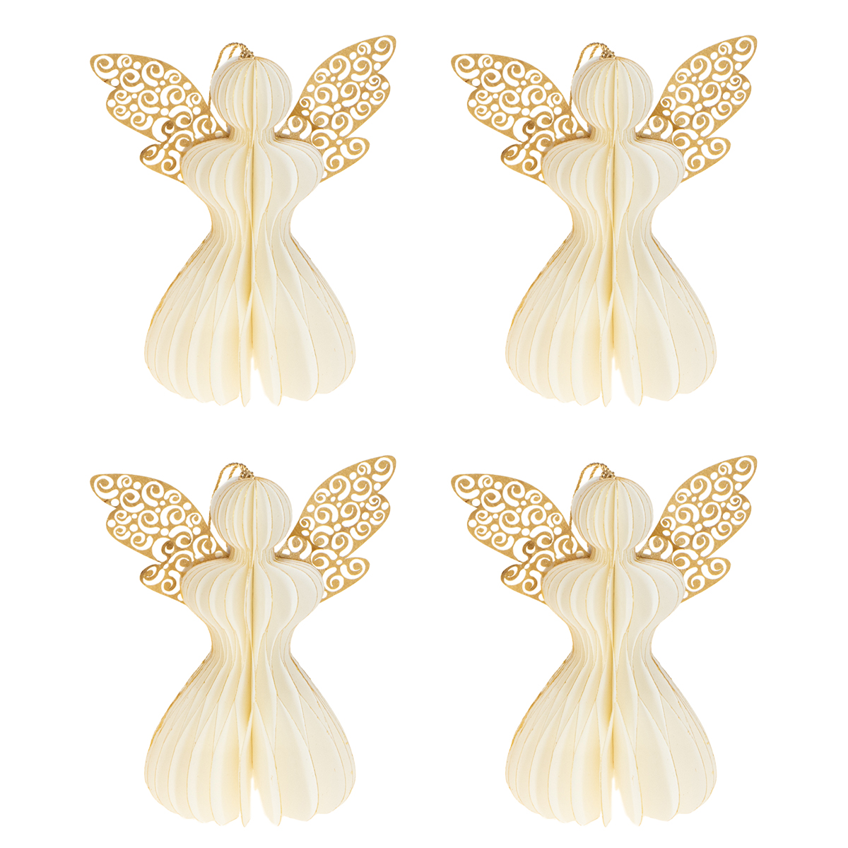 Ängelträdsdekorationer i papper, ängelhängen, vitt och guld, 12 cm, 4 stycken