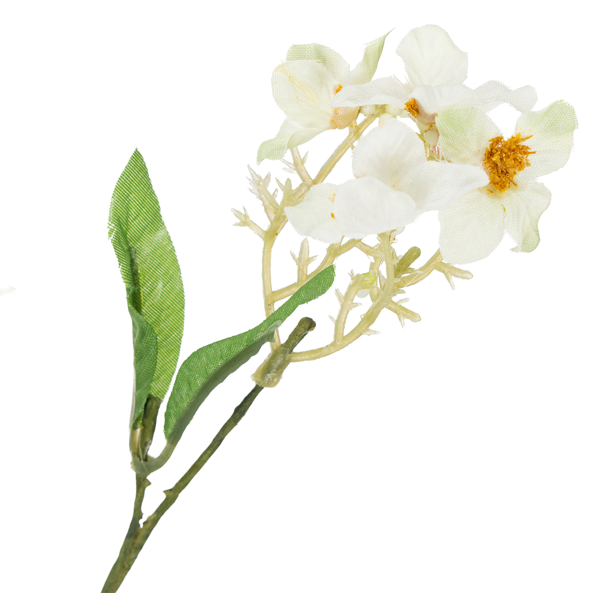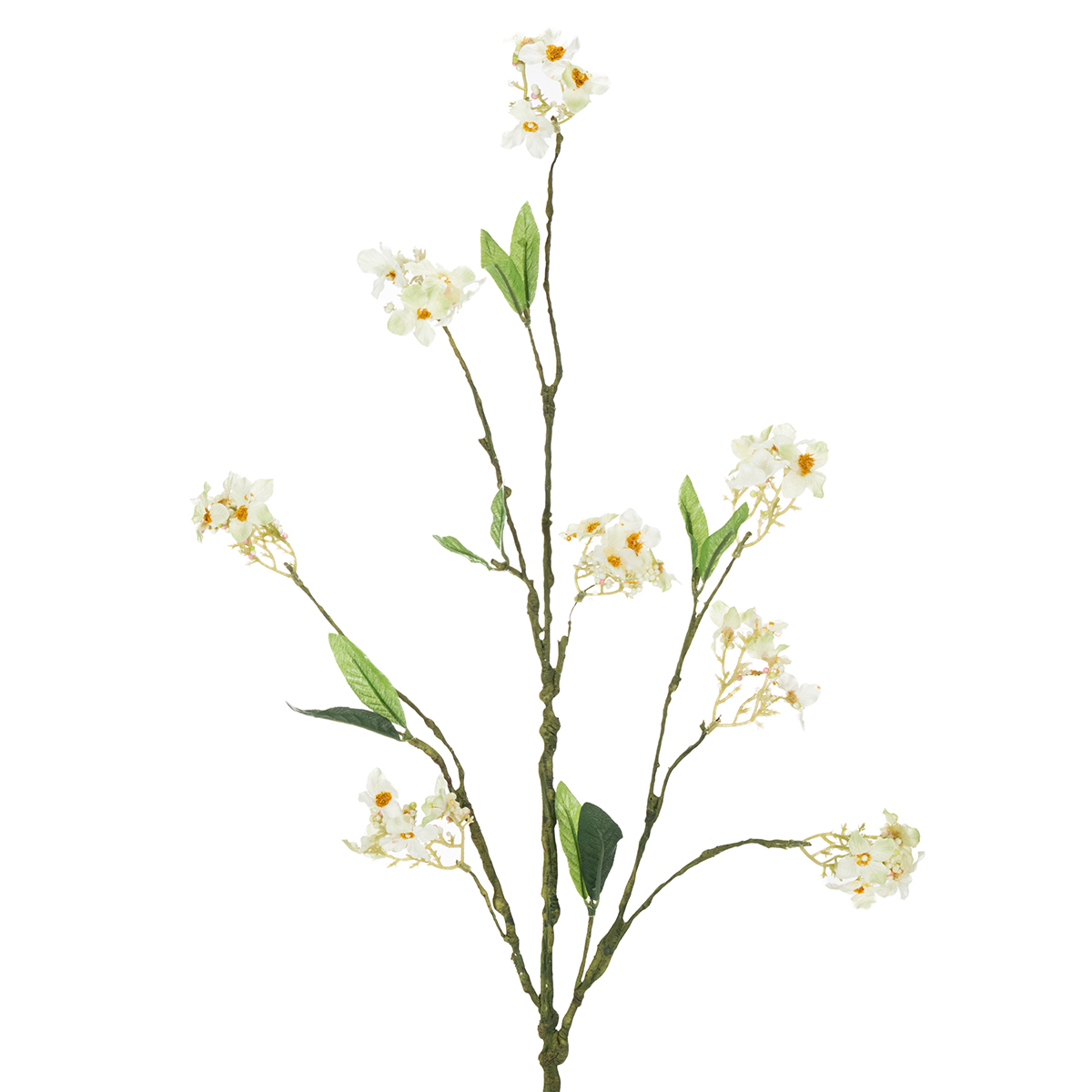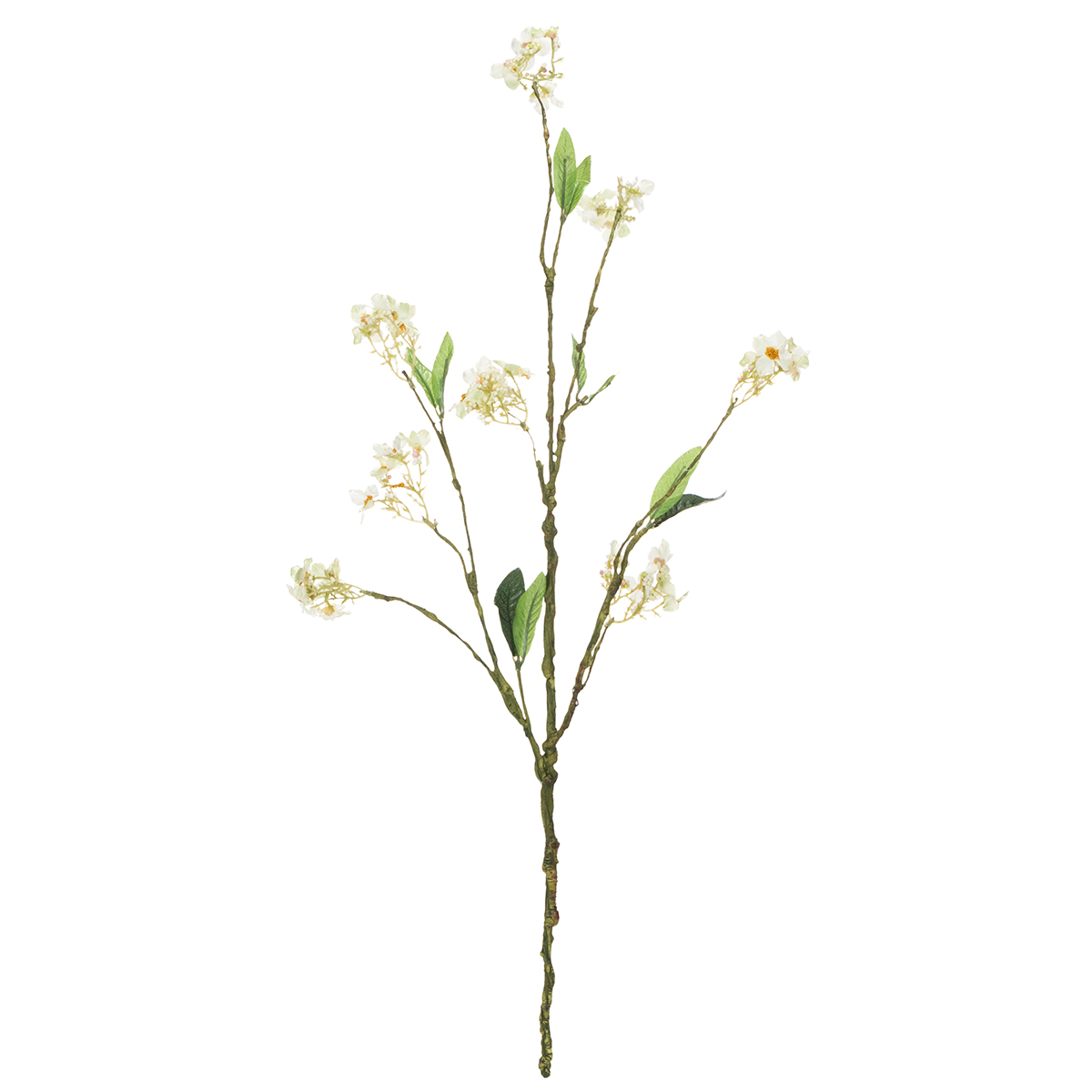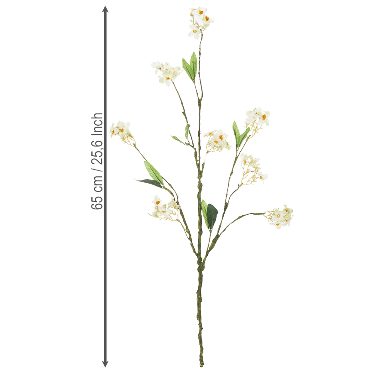 Liva upp dina vaser i vår med denna konstgjorda vita blomgren! Denna dekorativa gren är konstfullt modellerad efter en äppelträdgren, även känd på latin som "malus". De små vitgula blommorna och gröna bladen ger denna dekorativa gren ett särskilt vårigt, livfullt utseende som märkbart förhöjer vilket rum som helst. Du kan till exempel placera grenen med eleganta konstgjorda blommor i en snygg bordsvas för att lysa upp din matsal.