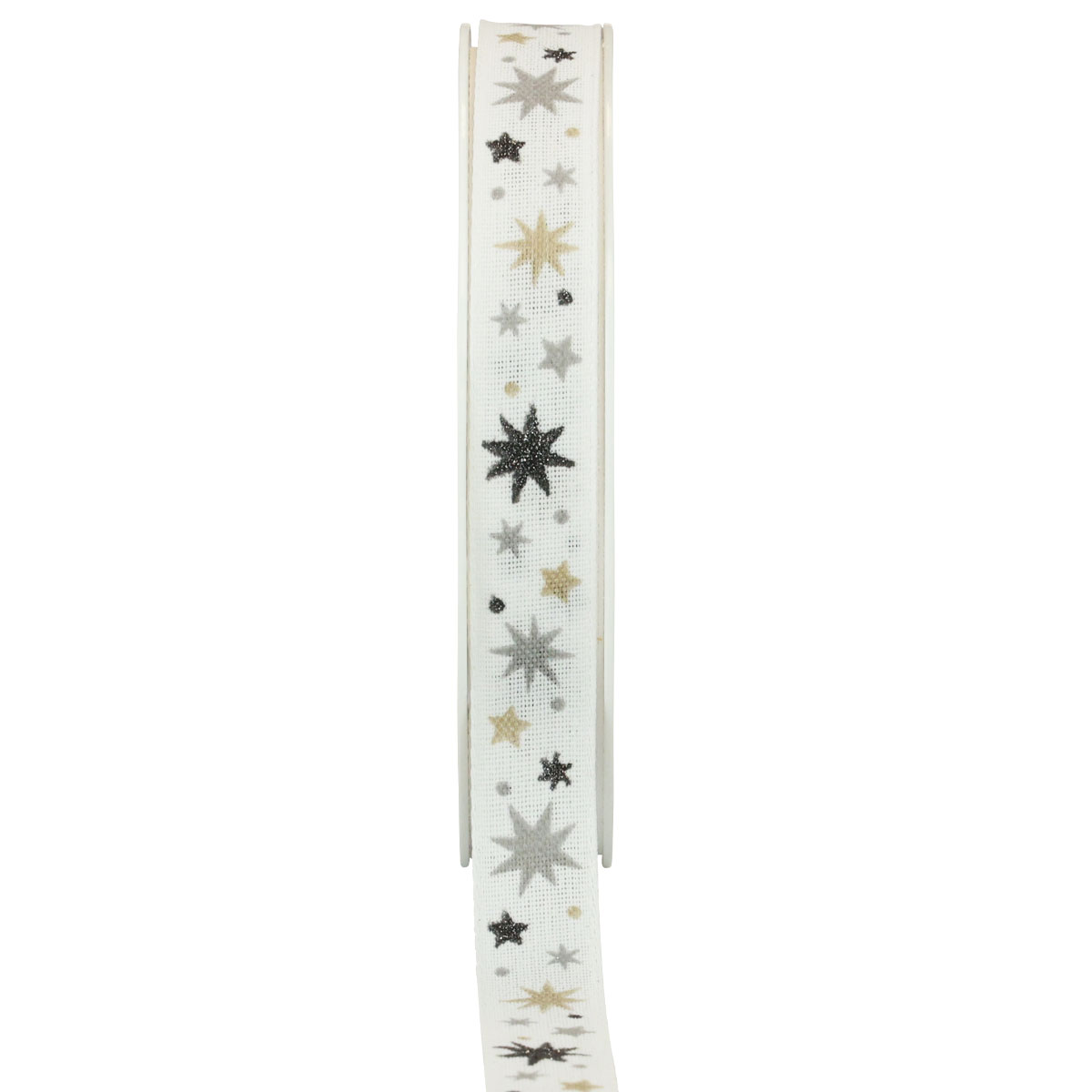 Mycket mer än ett klassiskt presentband: Detta vackra dekorativa band med ett stjärnmönster i grått och vitt kan användas för att implementera ett brett utbud av designidéer. På detta sätt ger du din juldekoration en personlig touch och framför allt kryddar du klassiska adventarrangemang och kransar. Det vita smyckenbandet är tillverkat av fint tyg, som förfinas av en kedja av grå glittrande stjärnor och prickar. På detta sätt skapar tejpen en elegant och elegant atmosfär som särskilt passar moderna restauranger och hotell.Juldekorationsbandet kan bearbetas till buketter av grangrönt och blommor på olika sätt - men om du vill prova något nytt kan du också använda det som en dekorativ galge för väggdekorationer och till exempel dörrkransar. Eller så kan du använda den för att linda in te-belysningshållare och dekorativa glasögon och omvandla dem till atmosfäriska borddekorationer eller festliga dekorationer för byråer, sidobord och skyltfönster på bara några enkla steg. Designa en rustik ljusstake i lantlig stil genom att linda det dekorativa bandet runt toppen av en murare och binda det i en vacker rosett. Du kan sedan placera en liten ljuskedja med ett batteri, ljuseffektfolie eller ett klassiskt telys i glaset.