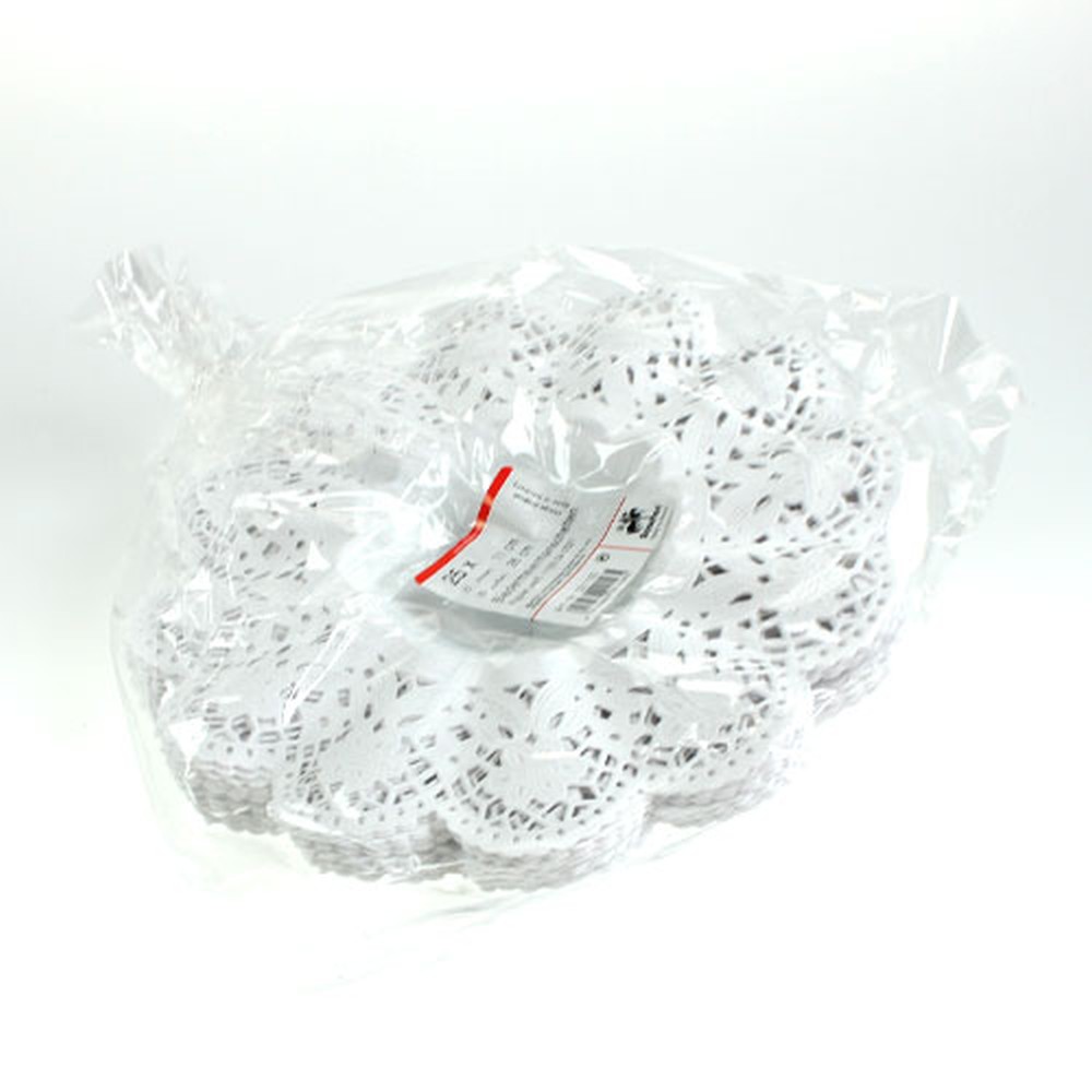 Biedermeier manschetter i vitt papper har vardera en ytterdiameter på cirka 26 centimeter och erbjuds i en uppsättning av 25 stycken. Den centrala öppningen är ungefär 11 centimeter.