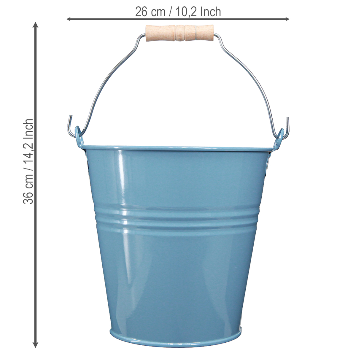 Upptäck den charmiga dekorativa hinken i tidlöst blått. Denna metallkruka imponerar med sin eleganta lätthet och robusta kvalitet. Utrustad med ett trähandtag kombinerar den funktionalitet med dekorativ dragningskraft, perfekt för inomhus- och utomhusdekoration.