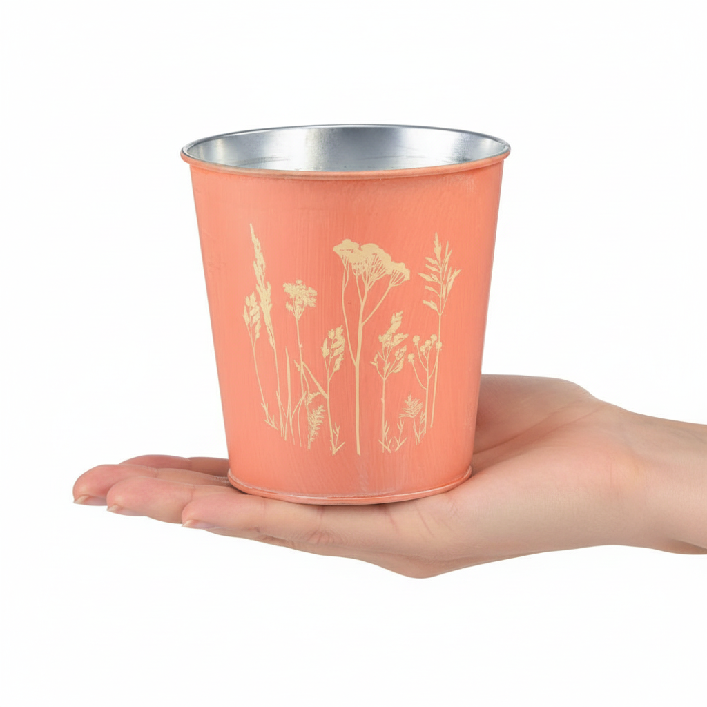 Du kommer att få en blomkruka i metall dekorerad på ena sidan. Vi har även andra varianter av denna somriga blomkruka i vårt sortiment.