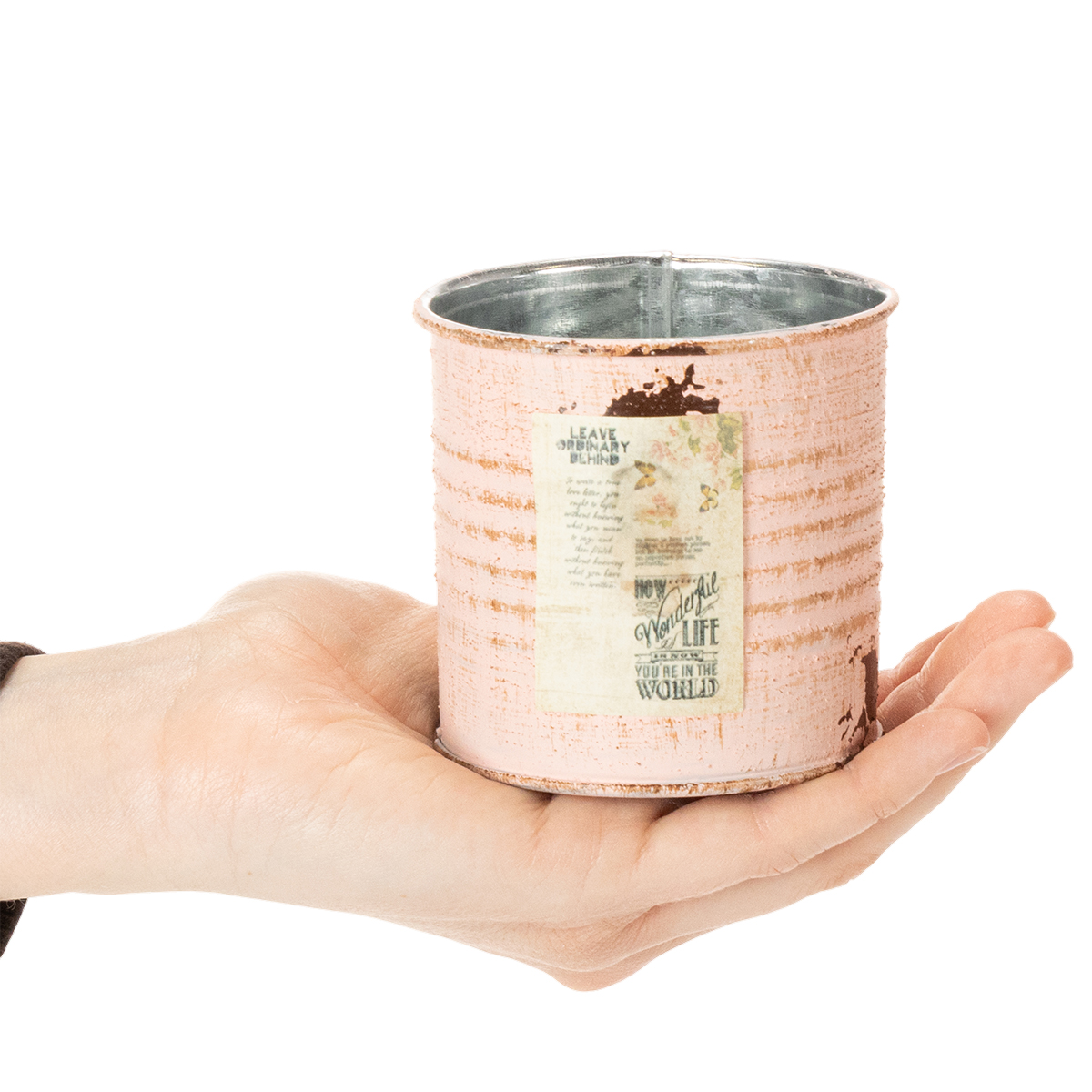 Som blomkruka blir dekorlådan i den laxfärgade varianten garanterat ett blickfång! Den lilla plåtburken av metall är sprayad silver på insidan och tvåfärgad på utsidan med vintagefärg. Små detaljer som en nostalgisk etikett och målade rostfläckar gör metallkrukan till ett gammaldags dekorativt föremål.