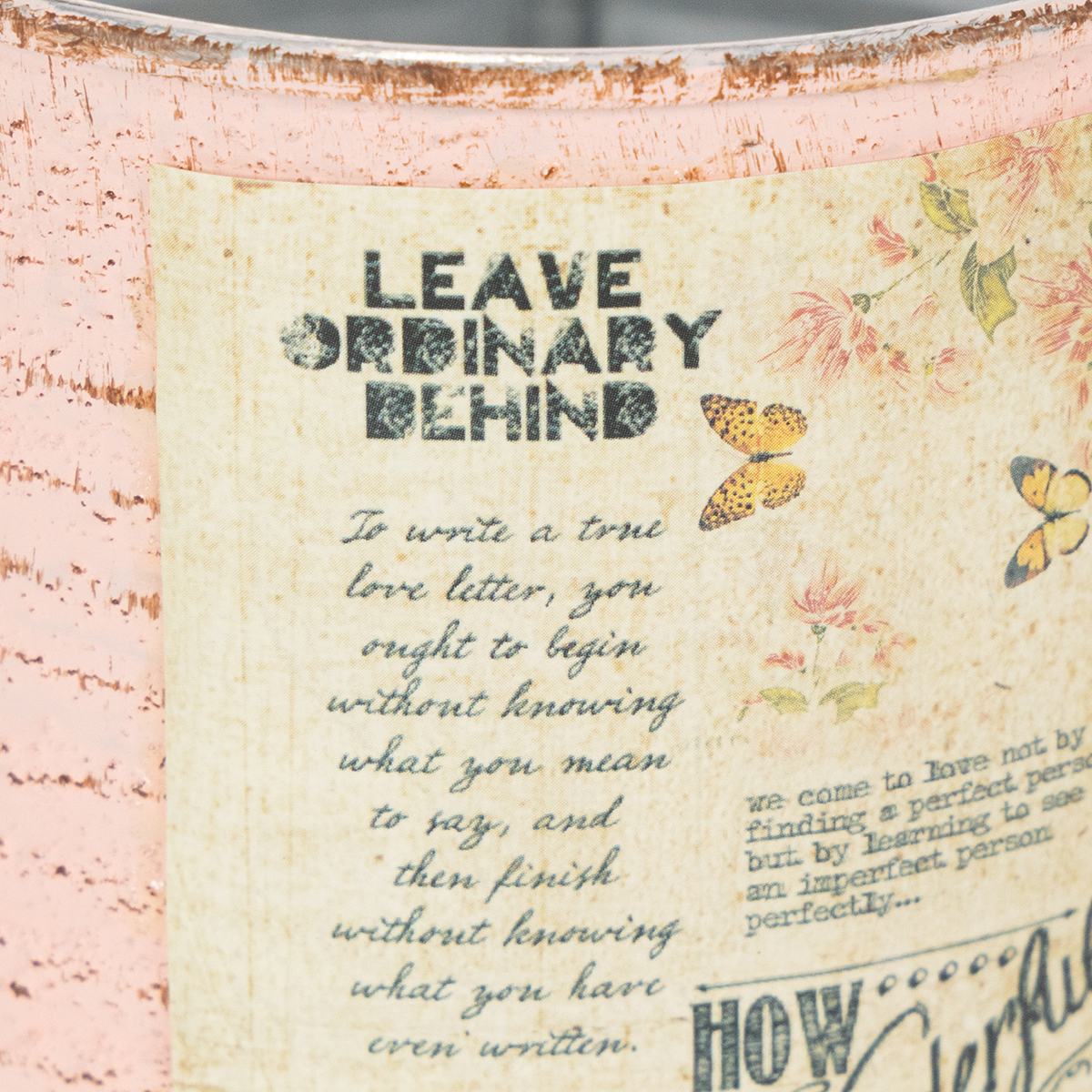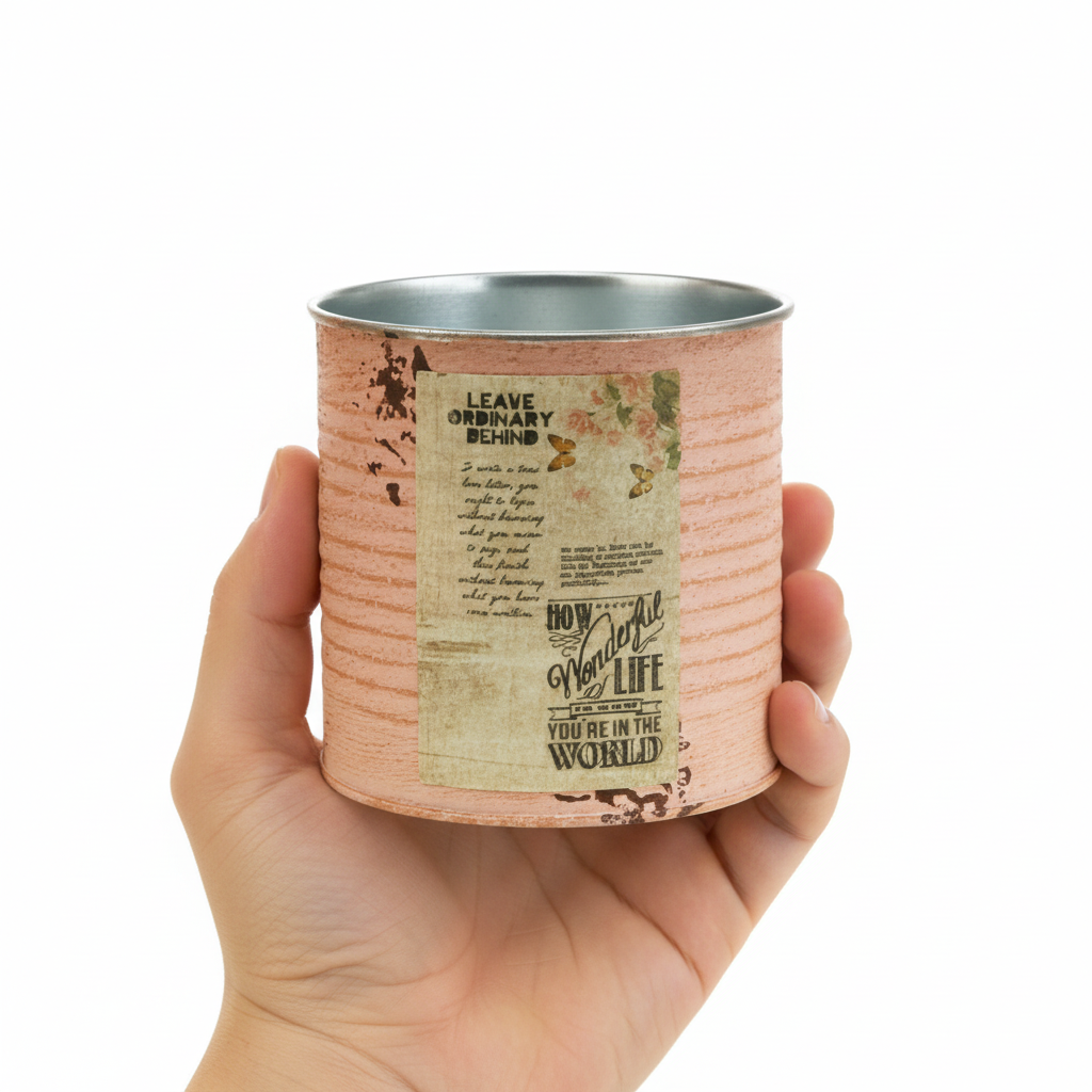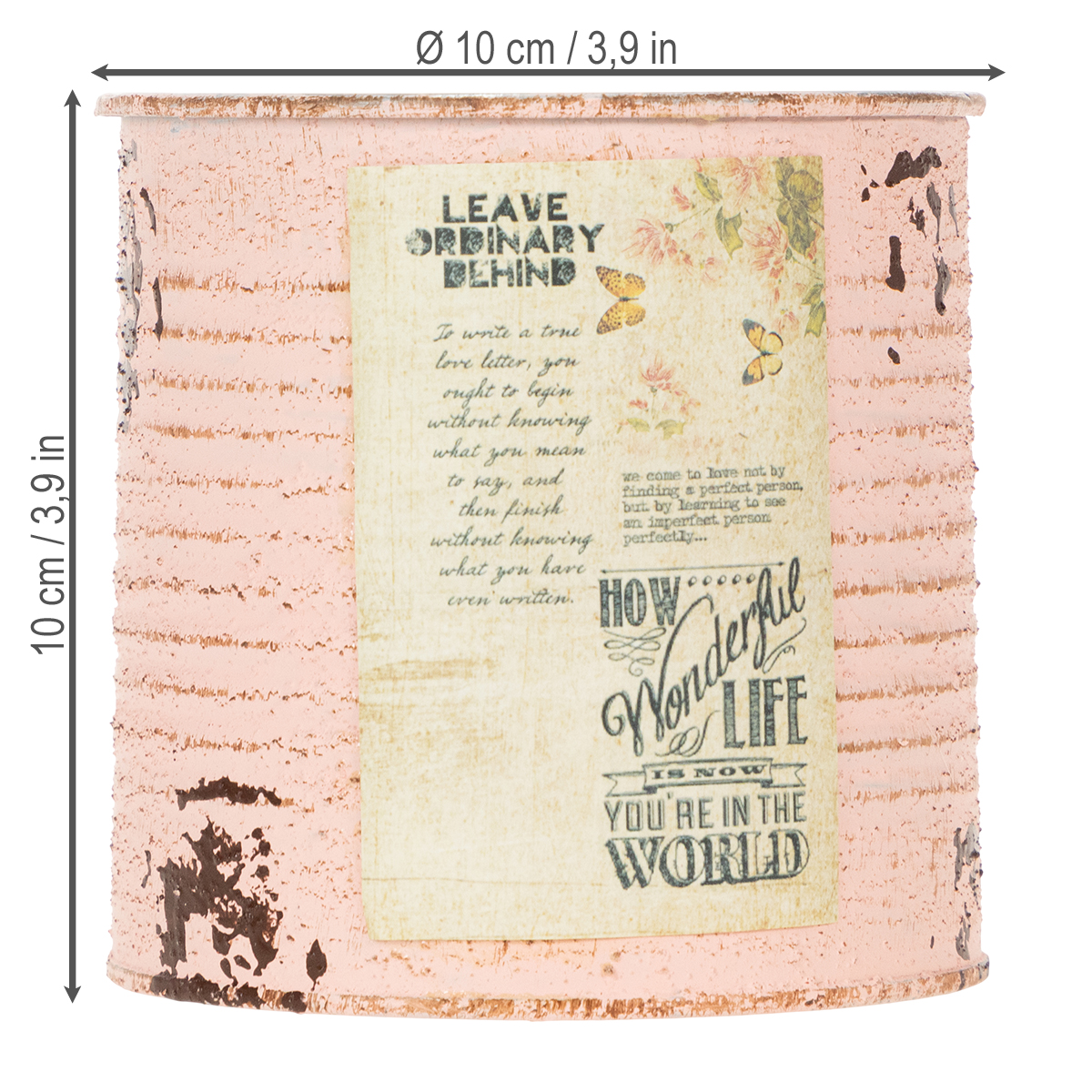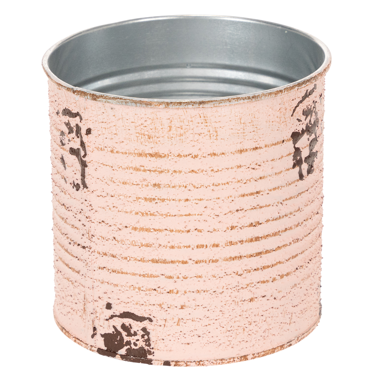Blomkrukan gjord av en dekorativ plåt i pastellfärgen lax är minst lika stämningsfull som en riktig vintageplåt. Sommardekorationen av metall har dock den avgörande fördelen att det inte finns några vassa kanter här. På så sätt kan du plantera plåtburken utan risk för skador. En rostig brun nyans framträder under den borstade pastellfärgen på plåtens skåror. Dessutom framhäver målade rostfläckar och en nostalgisk etikett retroburkens shabby chic. Dekorkrukans insida hålls väldigt enkelt i silver.