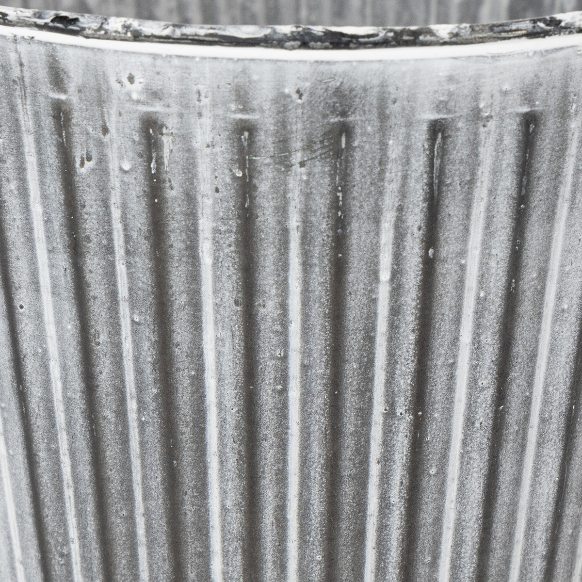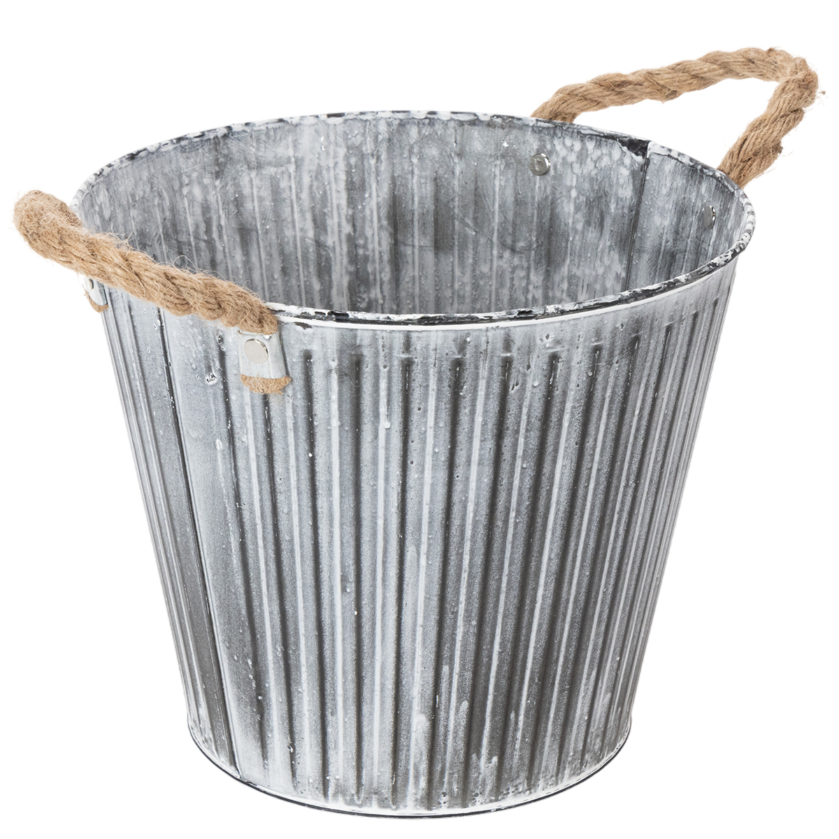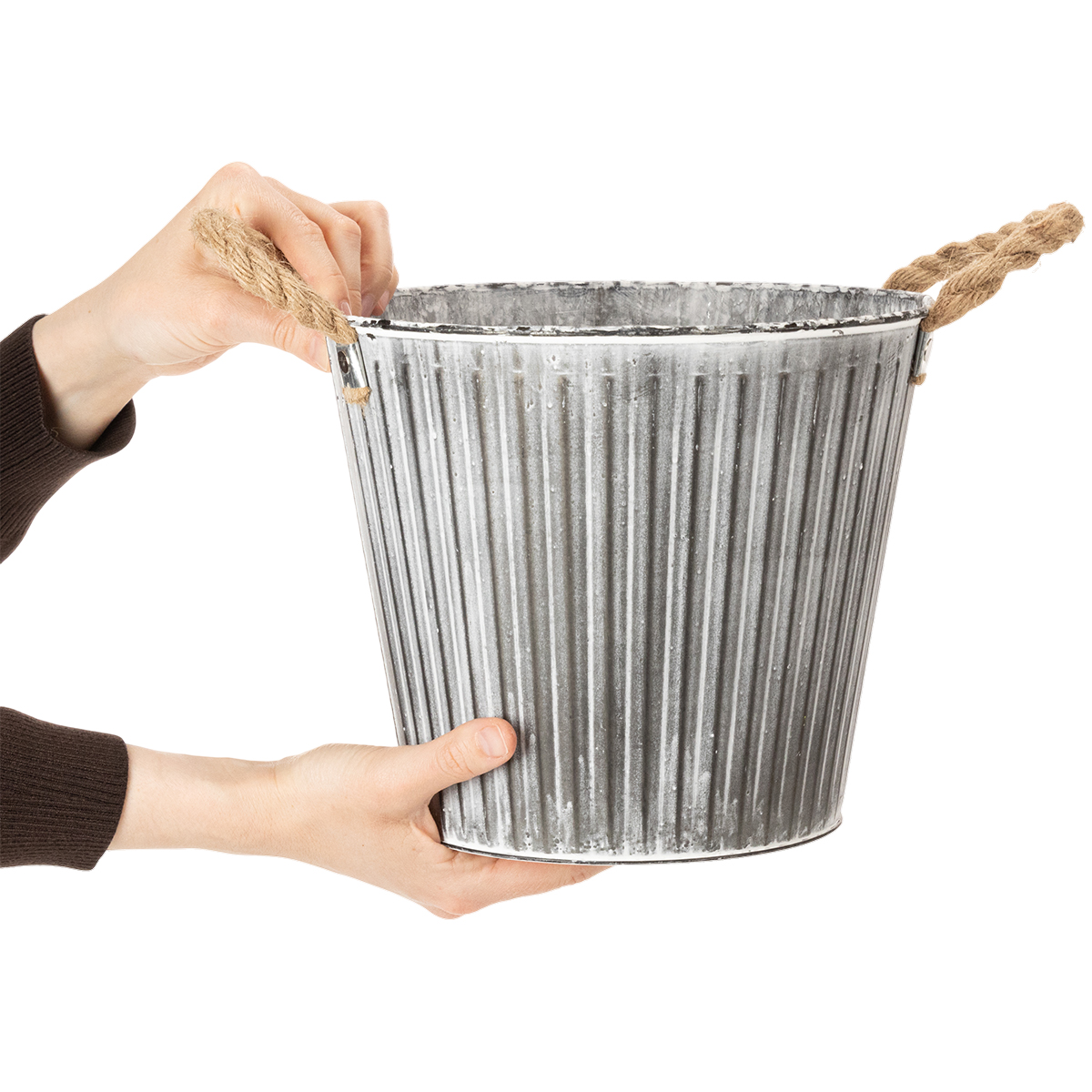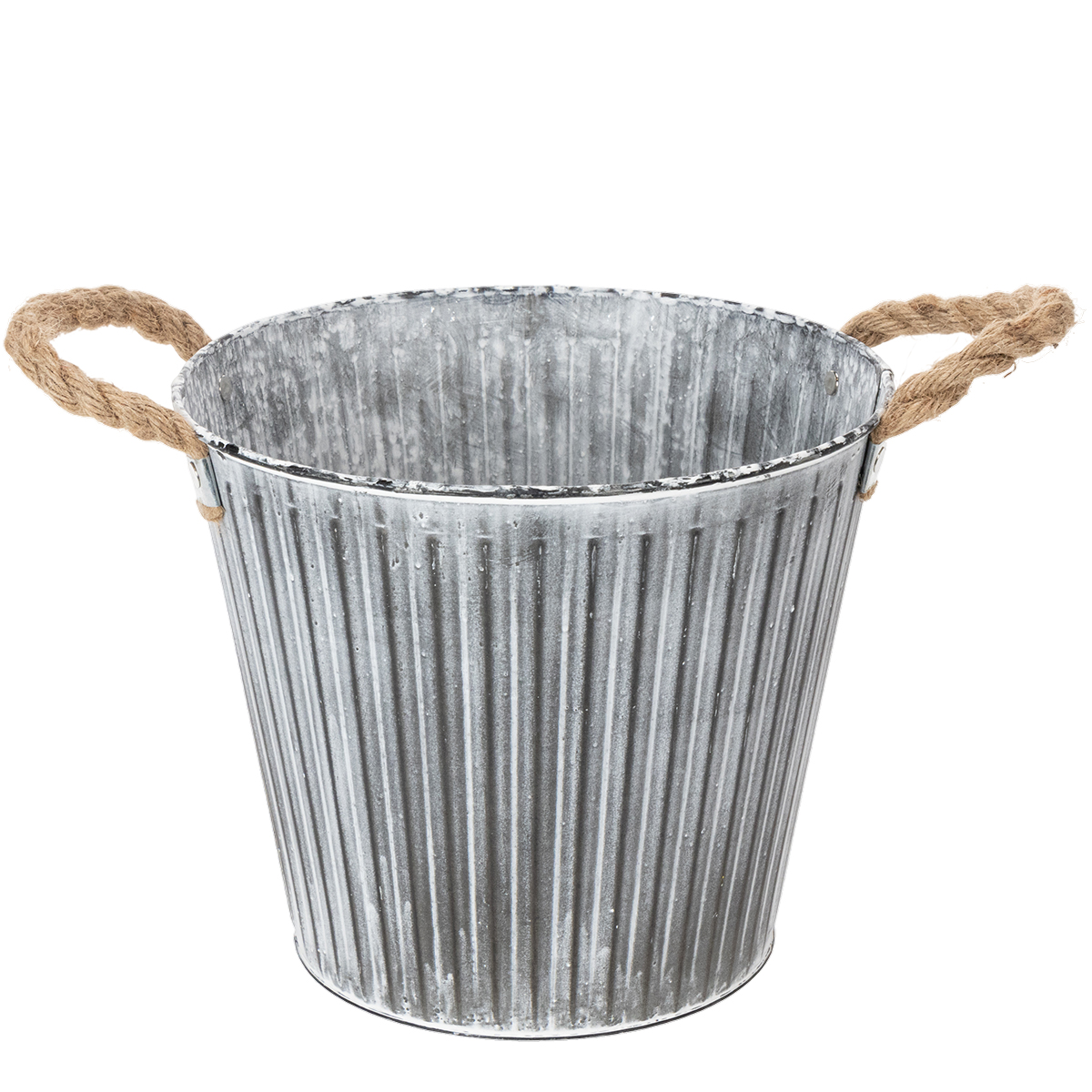 Denna planter är en underbar metalldekoration i den trendiga shabby chic! Vertikala präglade linjer runtom, som framhävs i kontrast genom att tvätta vitt, pryder den vackra dekorativa kruka med handtag av jute på båda sidor.