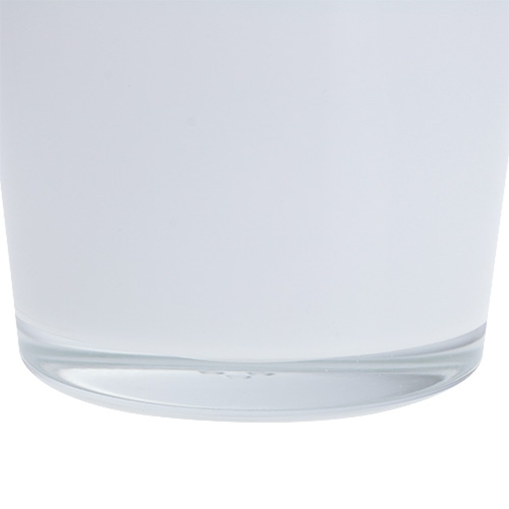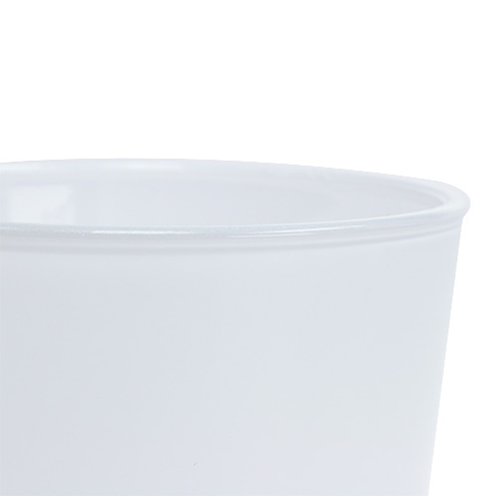 Den lilla planteraren är gjord av stabilt glas, vilket är nästan ogenomskinligt tack vare den vita färgen. Den har en total diameter på cirka 10 centimeter, öppningsdiametern är ungefär 9 och höjden cirka 8,5 centimeter. Fotavtrycket är ungefär 8 centimeter.