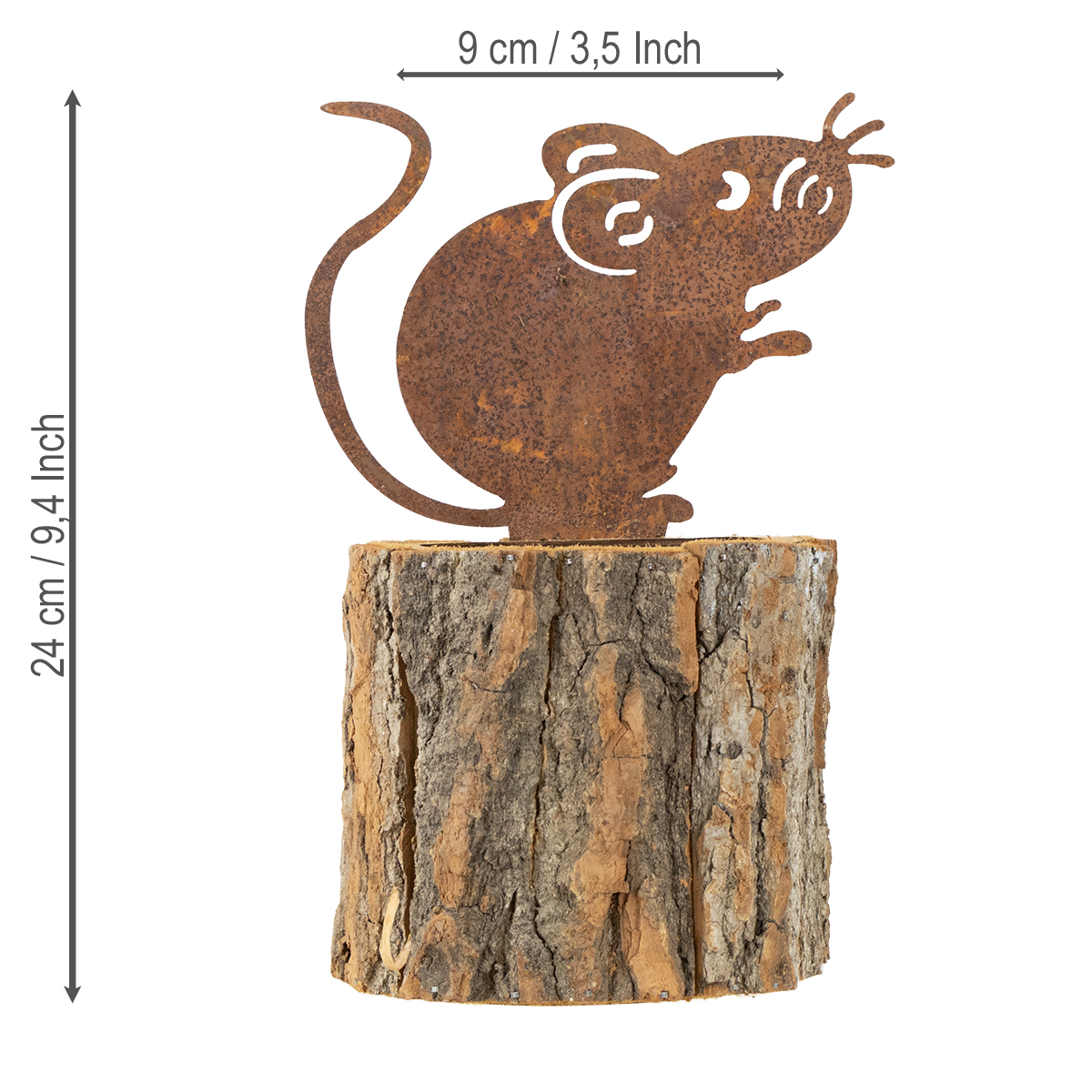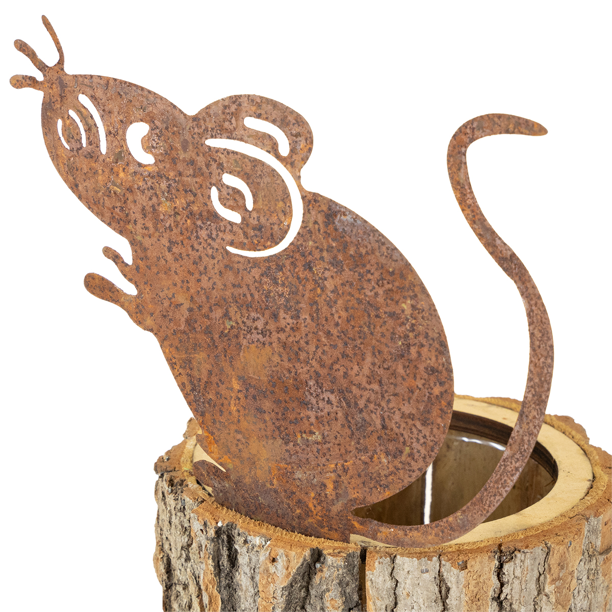 På kanten sitter en plåtmus som är täckt med en underbar patina av patina. Öppningen i toppen består av en träring genom vilken olika växter kan sättas in.