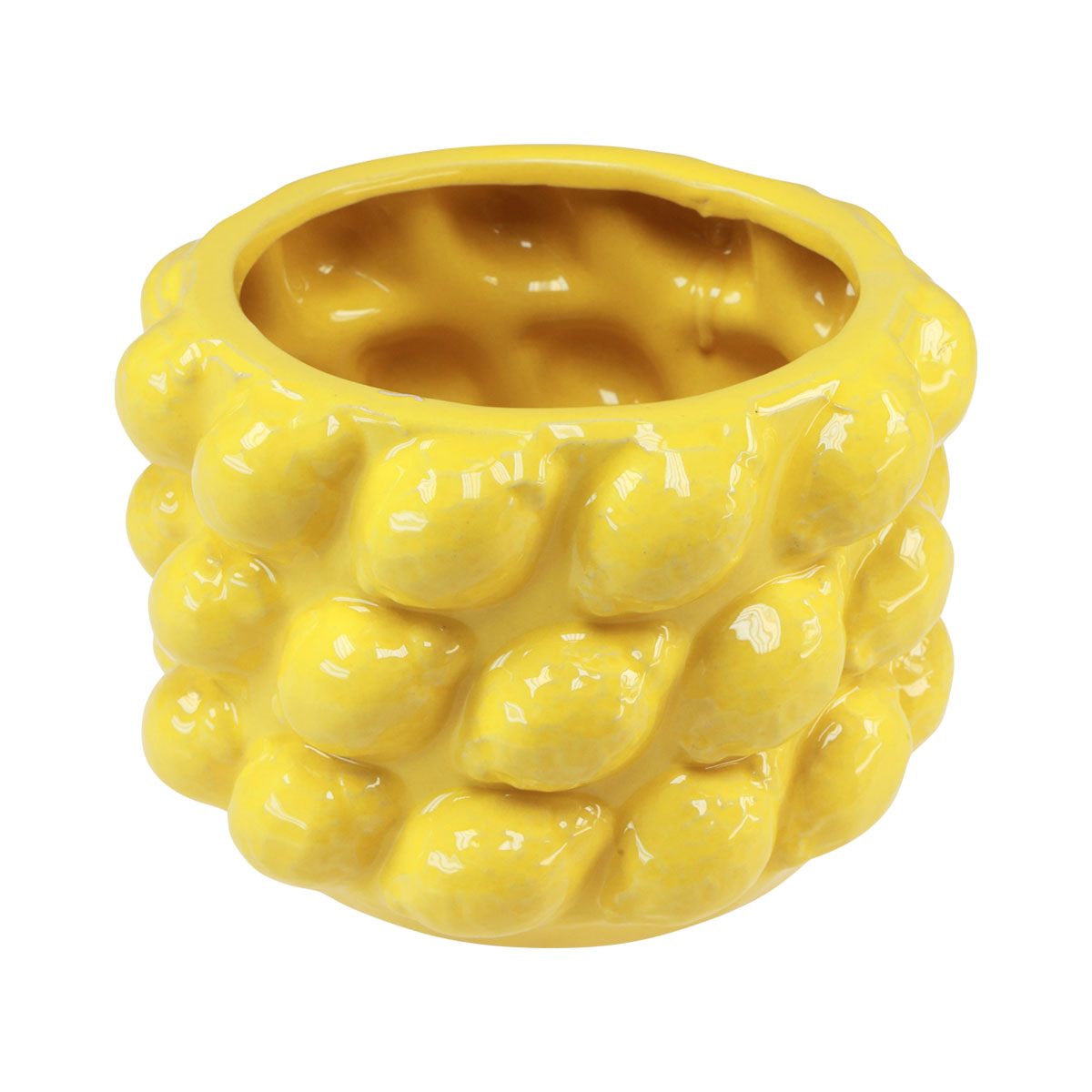 Glaserad gul, påminner denna unika citronvas omedelbart om medelhavscitrusfrukter. Utsidans skulpturala design med många små citroner ger krukan ett livligt utseende.