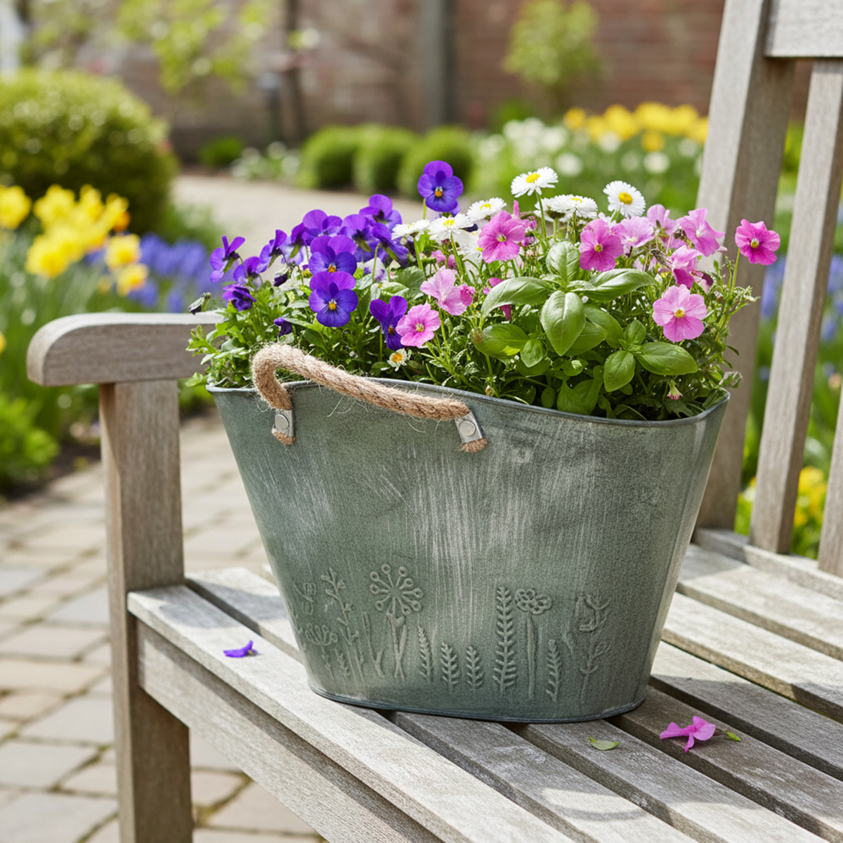 Denna blomkruka med handtag väntar på dina nyinköpta vårblommor! Eftersom planteringsmaskinen ursprungligen är designad som en väska av metall och jute.