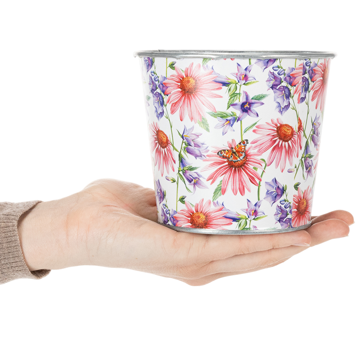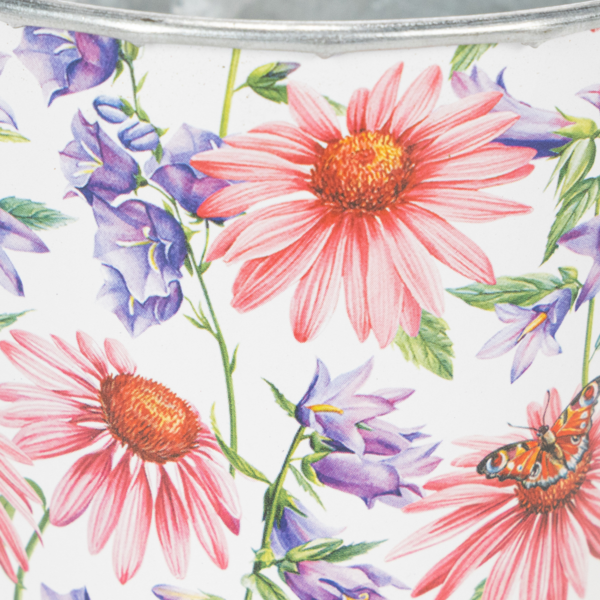 Alla blommor blommar i denna vackert nostalgiska blomkruka för vårdekoration! Metallkrukan visar ett vårfräscht motiv med solhatt och blåklocka.