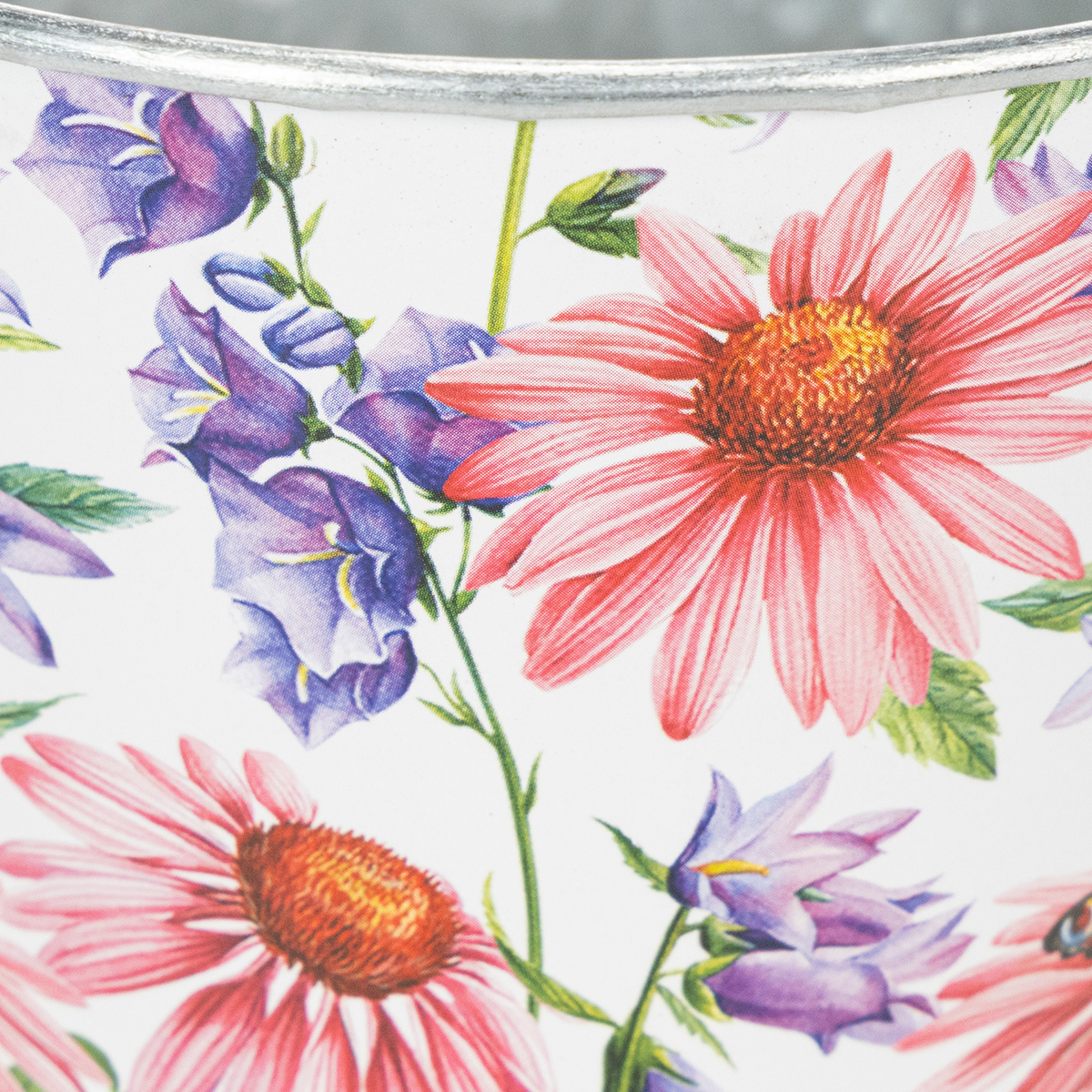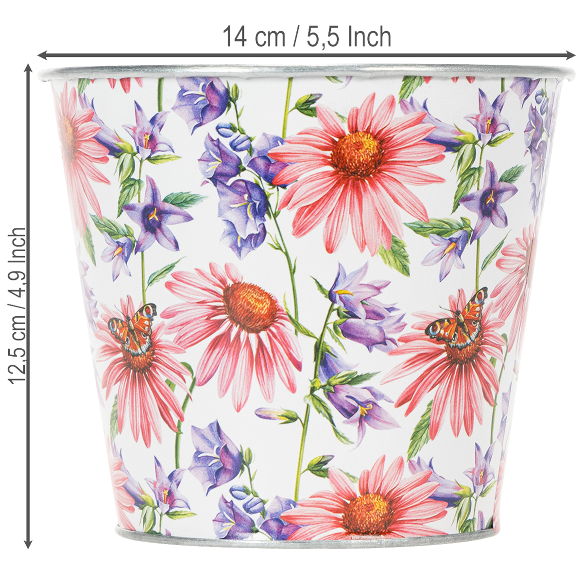 Medan blomtrycket är mycket exakt limmat på utsidan, glänser krukans insida och kanterna i den vackraste silverfärgade zinken. För direkt plantering i kruka rekommenderar vi en film som skyddar insidan från fukt.