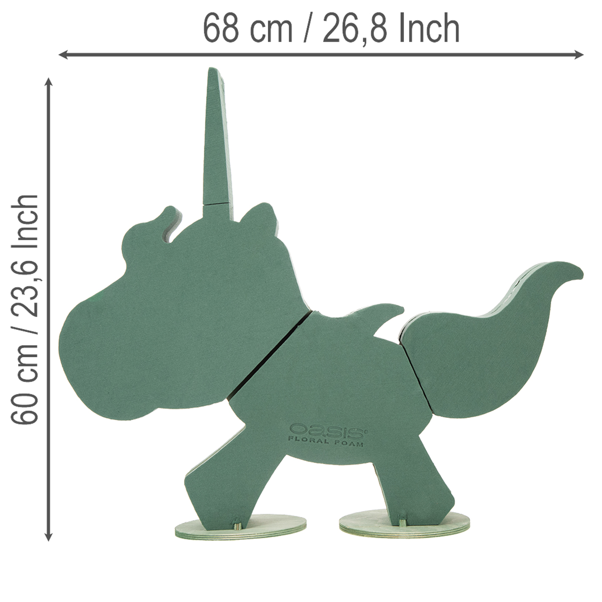 Få den trendiga enhörningen. Skapa en förtrollande original atmosfär vid din nästa fest eller evenemang! Enhörningen från OASIS® BIOLINE®-serien består huvudsakligen av grönt våt blommig skum. Den står på två stabila, gröna träbaser. Det mycket miljövänliga blomskummet är utrustat med snittlinjer. Dessa minimerar uttorkningen.