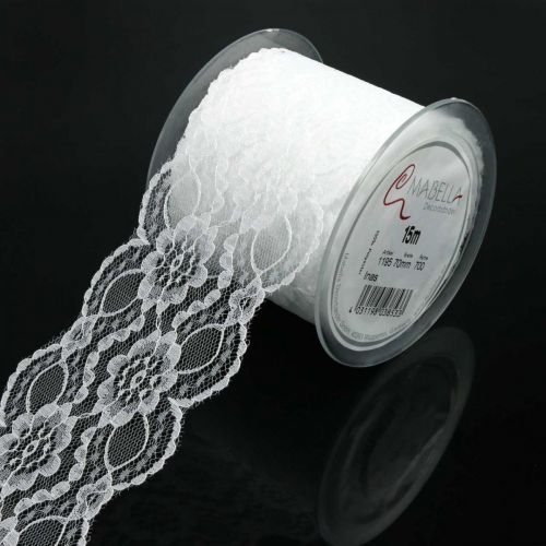 Det vita dekorbandet är tillverkat av 100 % högkvalitativ polyester, är cirka 70 millimeter brett och cirka 15 meter långt. Du får bandet av dekorativ spets upprullat på en plastspole, på vilken det fästs med en liten pärlnål.