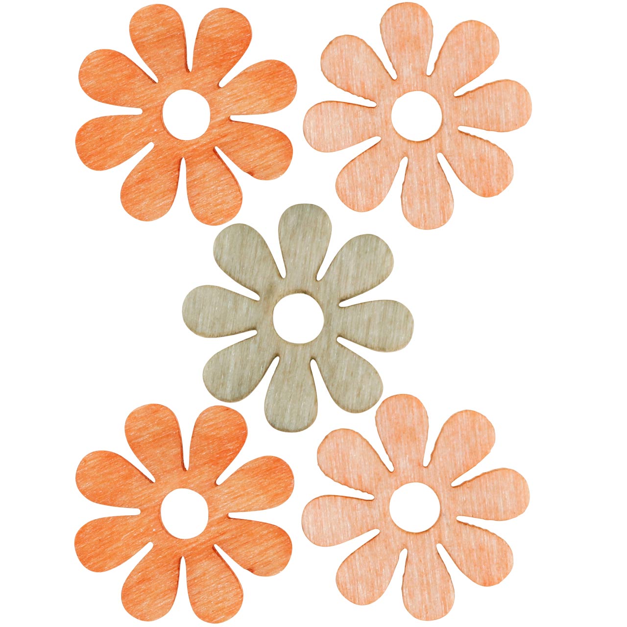 Du får träblommorna som en spriddekoration i en plastlåda för totalt cirka 144 blommor. Blommorna är vardera aprikos, beige och orange och har en diameter på cirka 2 centimeter och en tjocklek på cirka 2 millimeter.