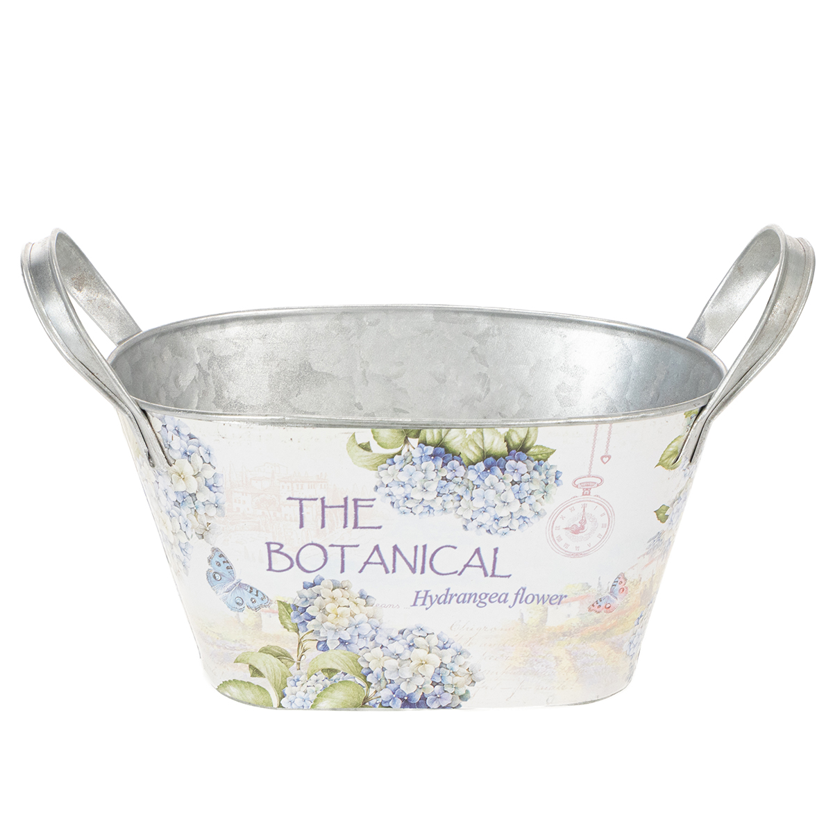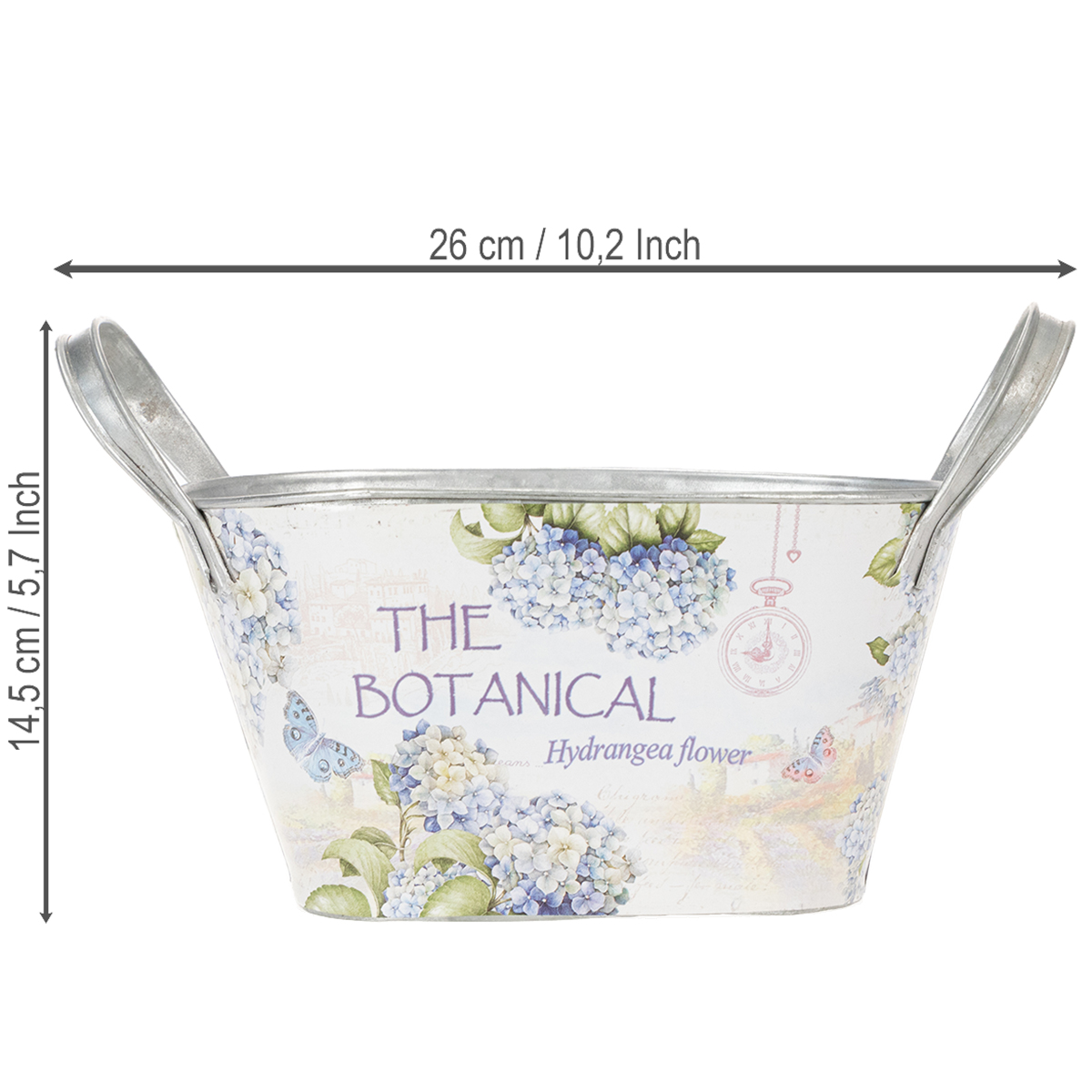 Den ovala blomskålen med handtag är ett charmigt sätt att lysa upp din sommar med snygga metalldekorationer! Trycket med blå hortensior förmedlar känslan av varma dagar i trädgården.