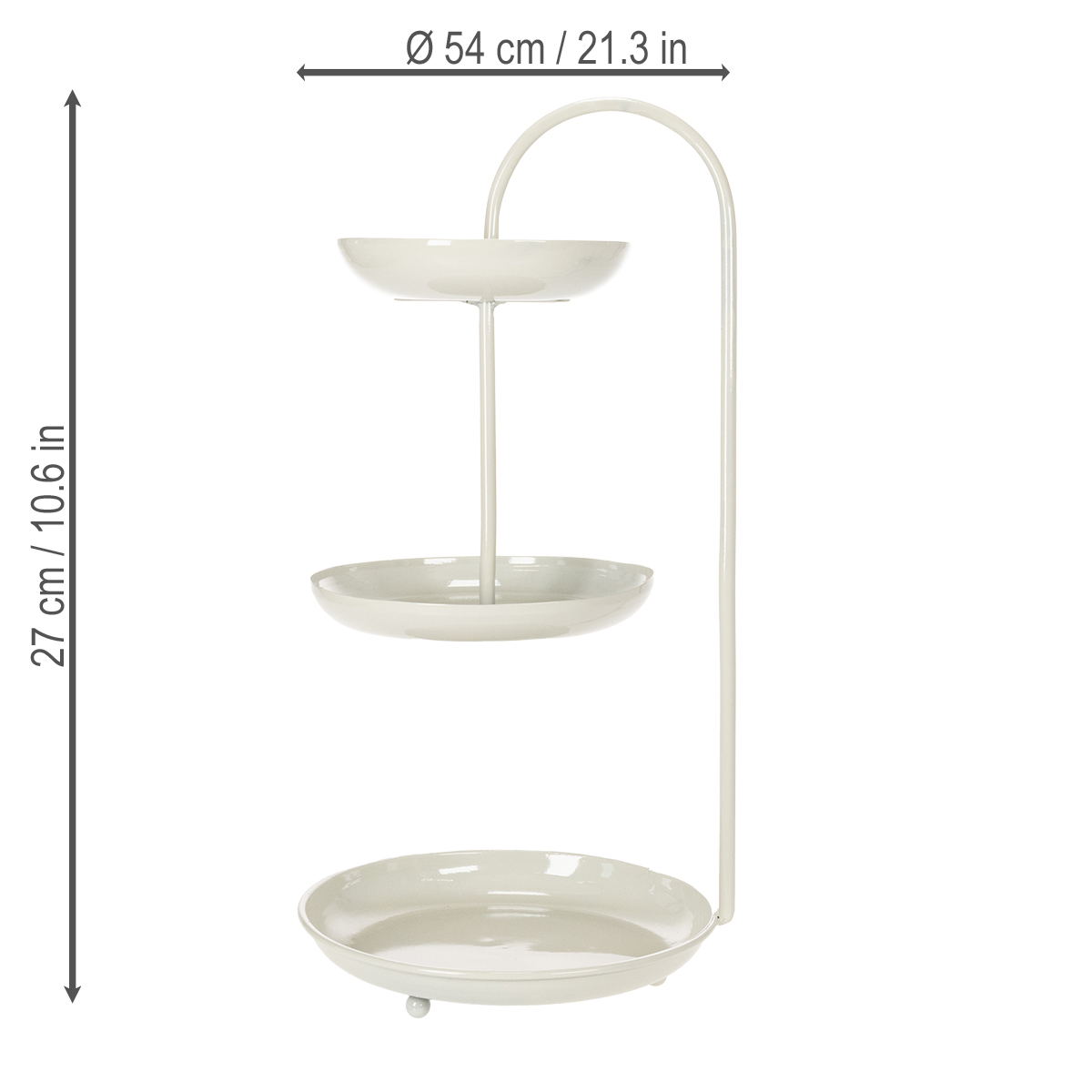 Med sitt rena, moderna utseende passar detta serveringsställ i tre nivåer in i alla rum och ger din inredning en speciell touch. De tre nivåerna har olika diametrar (26 cm, 23 cm och 18 cm) och erbjuder plats för förpackade matvaror eller dekorativa element. Det neutrala färgschemat gör det enkelt att kombinera med andra inredningsstilar – oavsett om det är minimalistiskt, skandinaviskt eller till och med bohemiskt. Stativet är också praktiskt: det är lätt att rengöra, platsbesparande och robust. Perfekt för användning på vardagsrumsbordet, som mittpunkt på ett bröllopsbord eller för temafester! Observera: det är inte lämpligt för oförpackade matvaror, så det är idealiskt för choklad, cupcakes i formar eller dekorativa figurer. Kombinera stället med andra Floristik24-artiklar, såsom en snygg bordslampa eller matchande blomvaser, för att perfekt fullända din atmosfär!