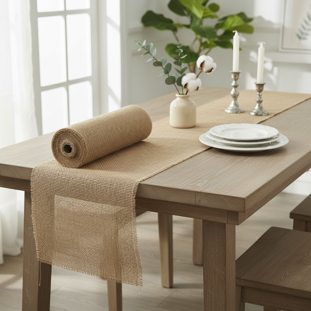 Jute bandet i naturen som en tabell löpare lindas i en rulle och kan rullas upp mycket lätt. Det dekorativa jutebandet har en längd på cirka 10 meter och en bredd av cirka 30 centimeter.