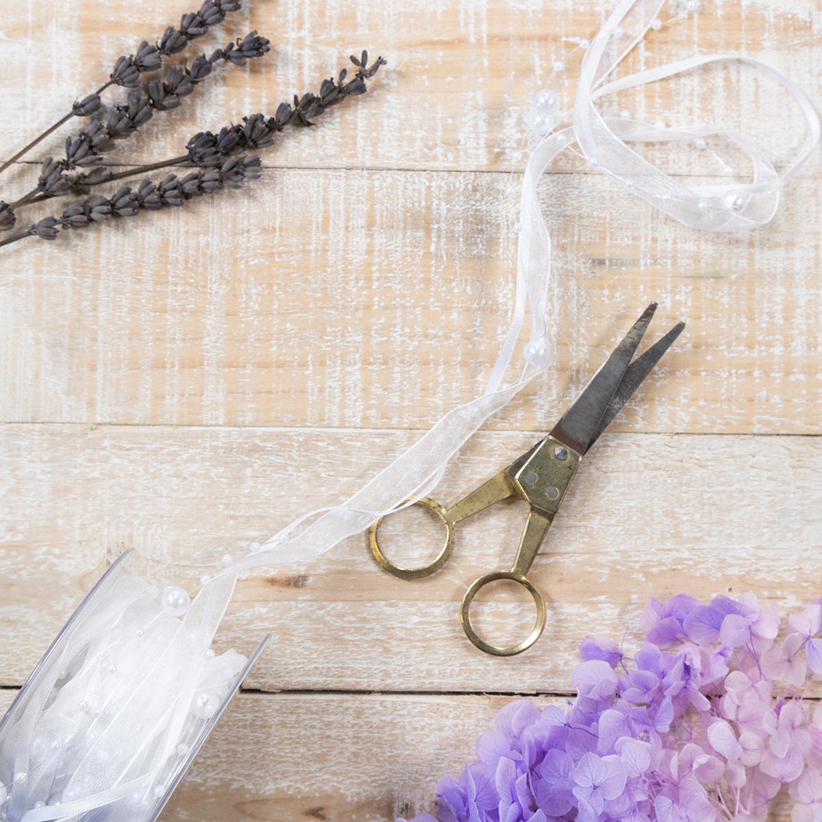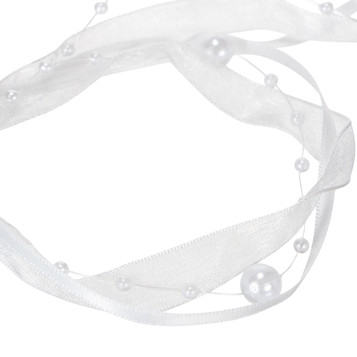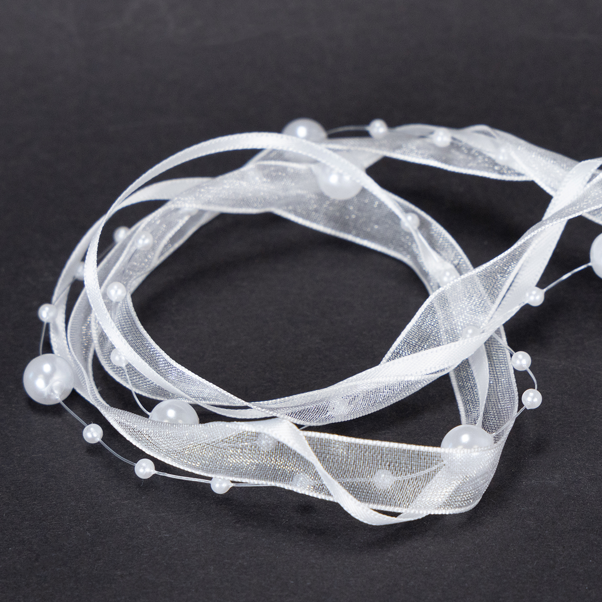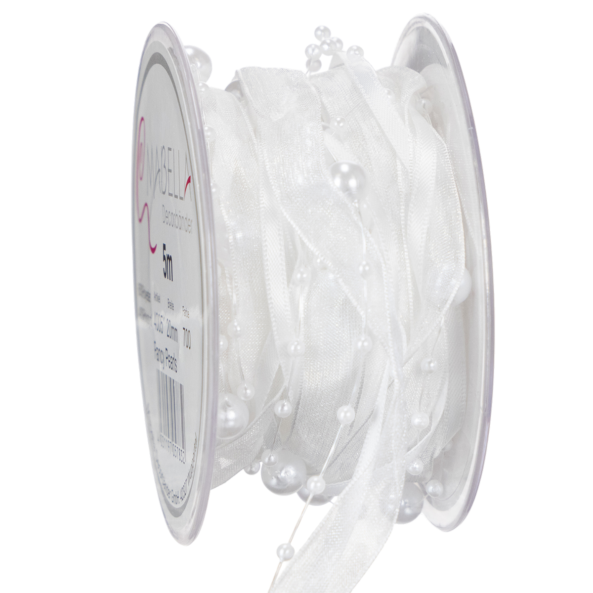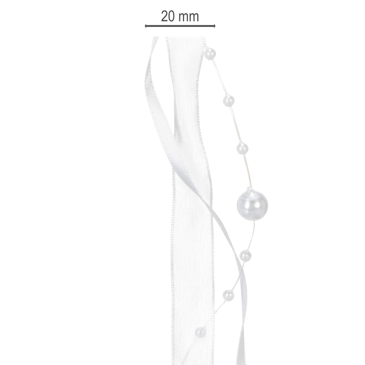 Bröllopsbandet i vitt har en längd på cirka 5 meter och är lindat på en rulle plast. Bredden är cirka 20 millimeter och pärlorna har en diameter av cirka 0,2 till cirka 0,8 centimeter.