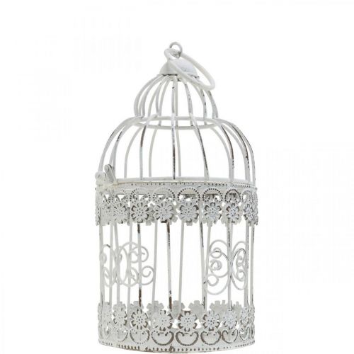 Den vackra dekorativa fågelburen är gjord för vårdekorationer! Den estetiska metalldekorationen används också på olika sätt i bröllopsdekorationer: Som en atmosfärisk stearinljusdekoration fylld med värmeljus, pelarljus eller LED-ljuskedjor eller dekorerad med små arrangemang av dekorativa grenar, mossa, siden och färska blommor samt dekorativa figurer som fåglar och hjärtan, gör fågelbonden i bröllopet - eller några vårdekorationer!Metallburet är dekorerat runt med fyra blommiga metallspiraler och två rader av små metallblommor. Den övre tredjedelen av den dekorativa buret kan öppnas med ett gångjärn. På så sätt har du en generös öppning för att dekorera fågelburet. Hela fågelburet är färgat vitt och har konstgjord slitage, vilket ger metalldekorationen ett rustikt, vintageutseende. Den dekorativa burens topp har en stor metallring, så fågelburet kan antingen hängas eller placeras.