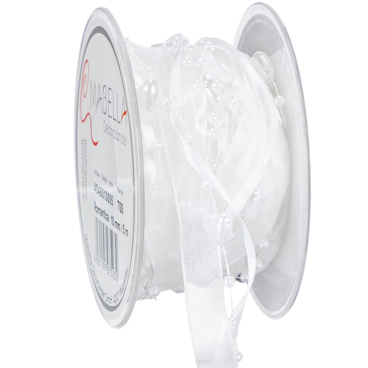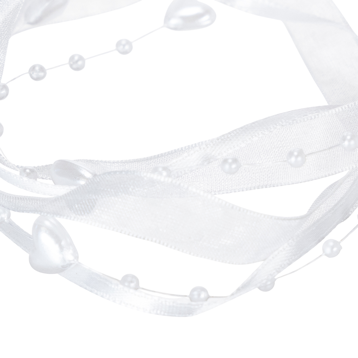 Produktnamn: Bröllopsdekoration organzaband vitt 10mm x 5m med hjärtan och pärlor