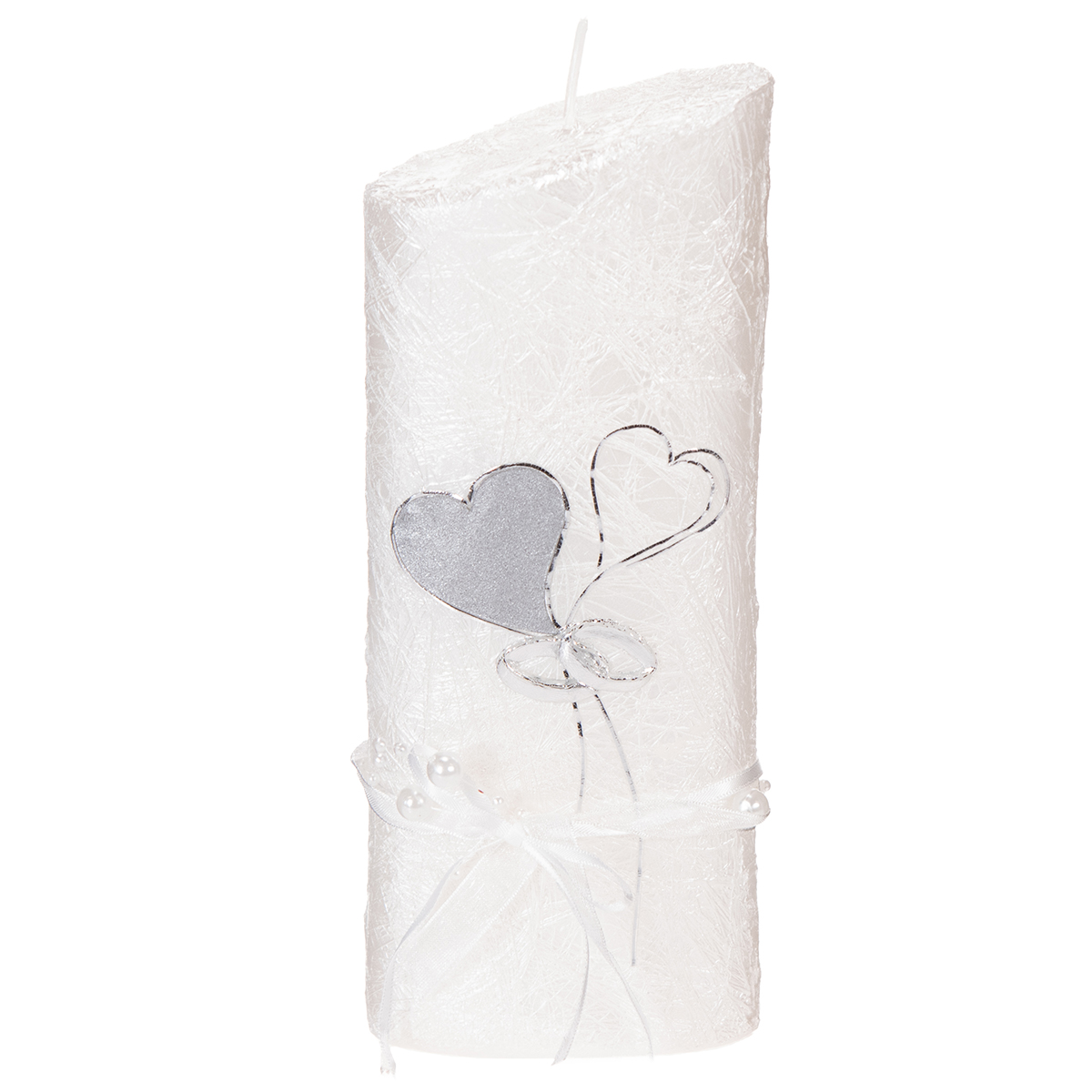 Två hjärtan på stjälkar hålls samman likt en blombukett av två sammanflätade ringar. Bröllopsljuset är också dekorerat med ett vitt band och pärlor, vilket ser vackert ut i bröllopsdekorationen. Denna dekoration måste dock tas bort innan ljuset tänds.
