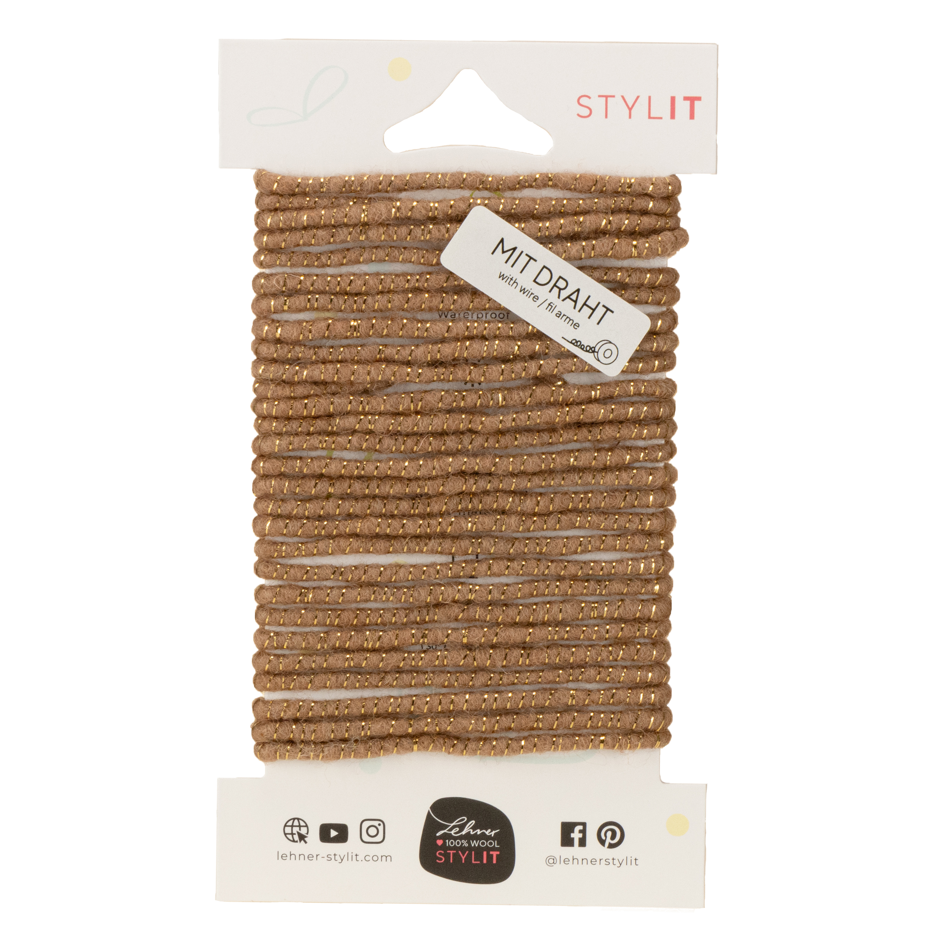 Produktnamn: Brunt ullsnöre med guldtråd, 5m x 5mm med ståltråd, för dekoration och pyssel