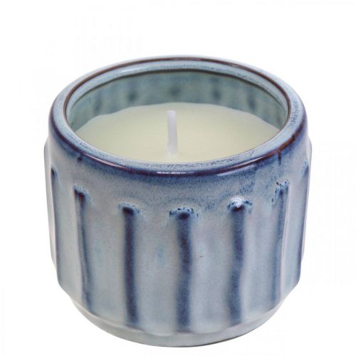 Citronellaljuset i grytan ger dig inte bara stämningsfull belysning på verandan på kvällen, utan också en stämningsfull doft. Doftljuset med citronarom säkerställer en avslappnad och avslappnad stämning varje kväll.Ljuset består huvudsakligen av paraffinvax med en liten mängd citronolja, vilket sprider den extra behagliga citrondoften. Citronellaljuset är i en ljusblå keramikkopp med räfflat mönster, vars kanter är markerade med mörkblå färg.
