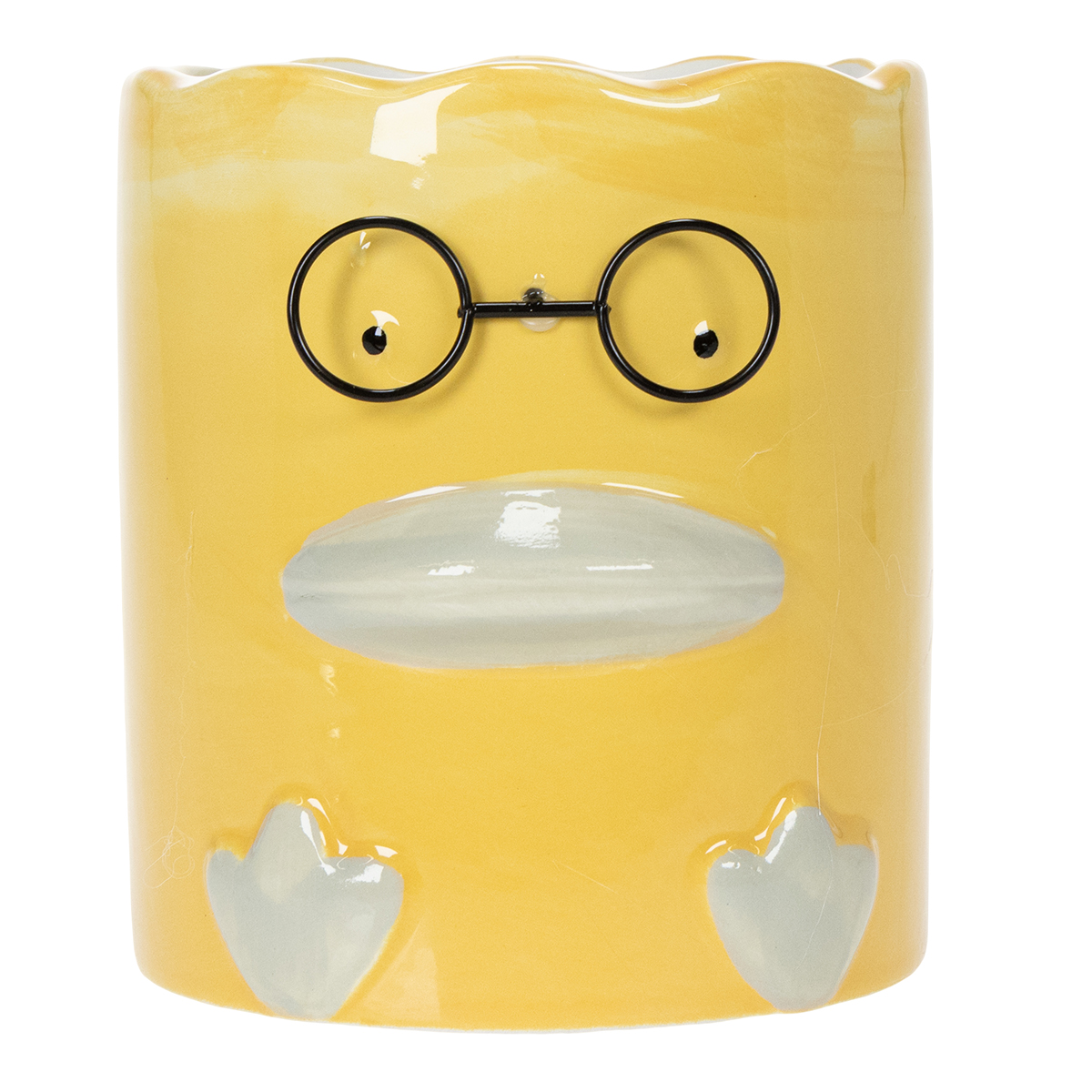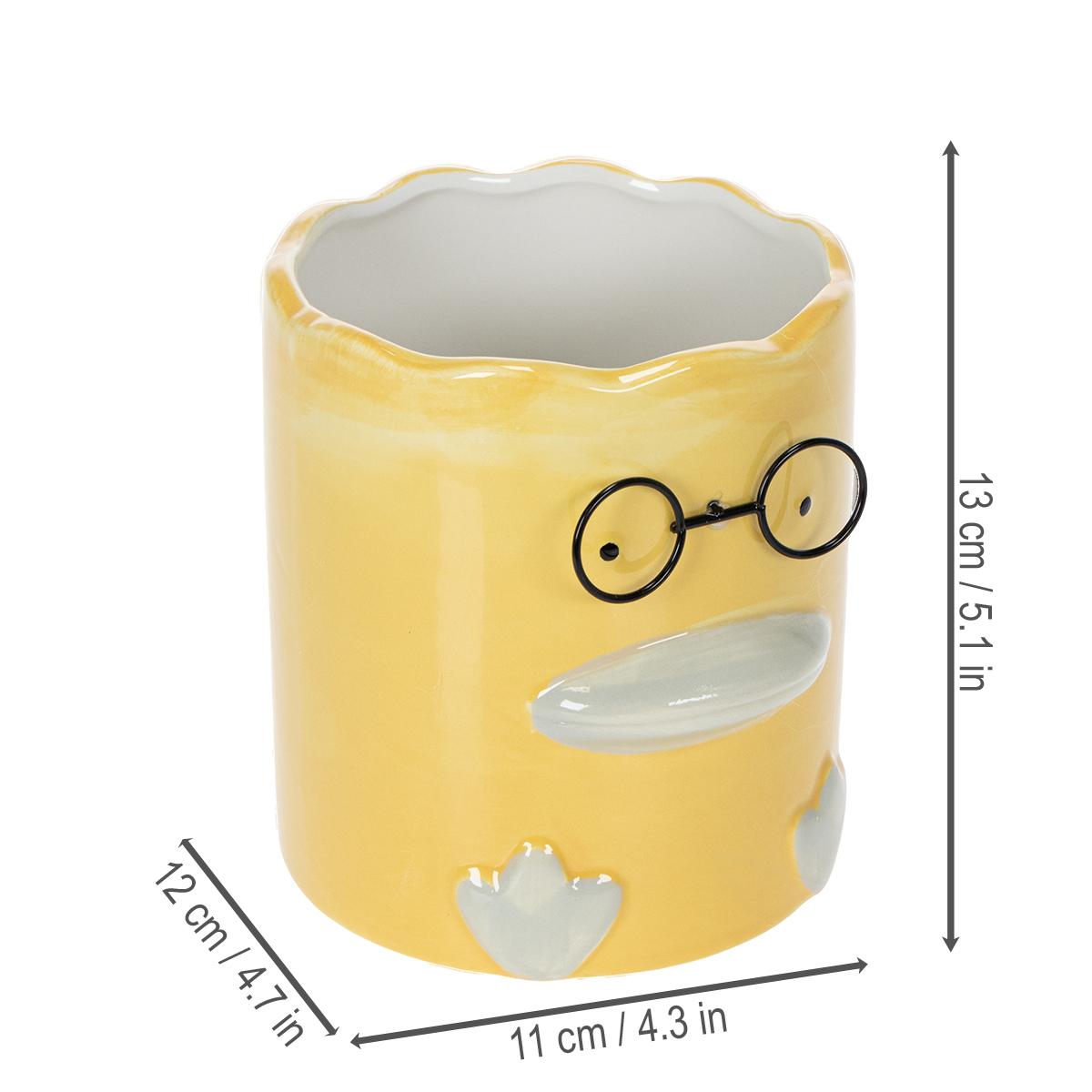 Denna gula keramikvas med djurmotiv kombinerar funktionalitet och estetik på ett verkligt speciellt sätt. Med en höjd på 13 cm och en diameter på 12 cm erbjuder den gott om plats för blommor, torkade blommor eller till och med pennor och kontorsmaterial. Den högkvalitativa keramiken garanterar stabilitet och hållbarhet, medan den charmiga ankdesignen, med sina fina detaljer som den vågiga öppningen och de finurliga glasen, ger en modern och humoristisk touch. Denna vas är idealisk för att visa upp ljusa torkade blommor eller färska snittblommor. För ett mer naturligt utseende kan den också planteras med små krukväxter som suckulenter. Den är också perfekt för att förvara pennor eller andra små föremål, vilket gör den till ett praktiskt tillskott till ett kontor eller barnrum. Denna dekorativa möbel är inte bara ett vackert tillskott till ditt eget hem utan också en underbar presentidé till vänner eller en inflyttningsfest. En perfekt blandning av praktisk användning och dekorativ skönhet!