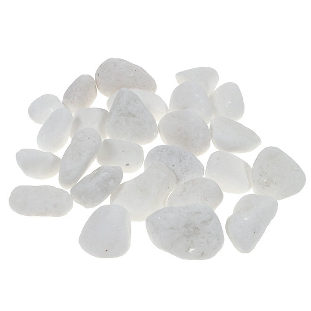 De dekorativa småstenarna i vitt levereras i ett nät och det hela väger runt 1 kilo. Varje sten var individuellt formad av naturen och de kan därför bli cirka 1 till 2,5 centimeter stora.
