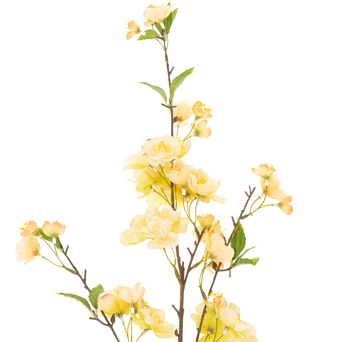 Ge dina hem- eller evenemangsdekorationer den där speciella touchen! Med sina fina blommor utstrålar denna gula körsbärsblomskvist inte bara fräschör utan också en ljus och välkomnande atmosfär. Tänk dig hur denna eleganta gren kommer att förvandla ditt vardagsrum, sovrum eller reception. Älskar du blommor men vill inte ha besväret med att ständigt ta hand om dem? Inga problem! Denna konstgjorda körsbärsblomskvist kombinerar skönhet och praktiskhet. Du behöver inte vattna den, men den ser lika förtrollande ut dag efter dag som den gjorde första dagen.