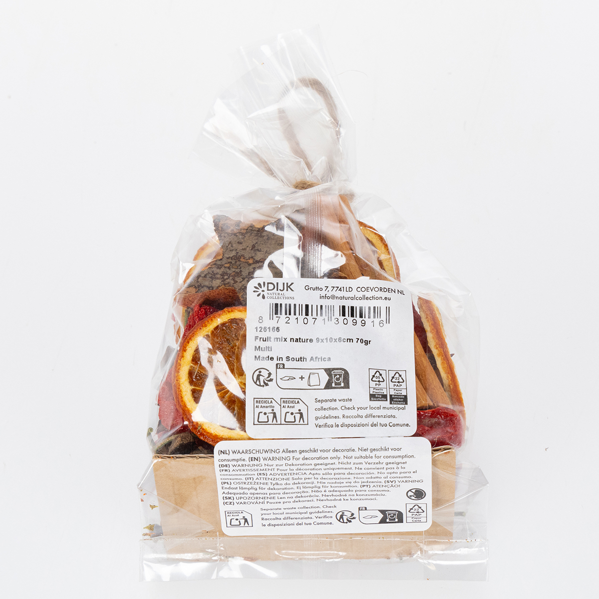 - Innehåll: Torkade apelsinskivor, kanelstänger, stjärnanis, trästjärnor, röda prydnadspaprikor