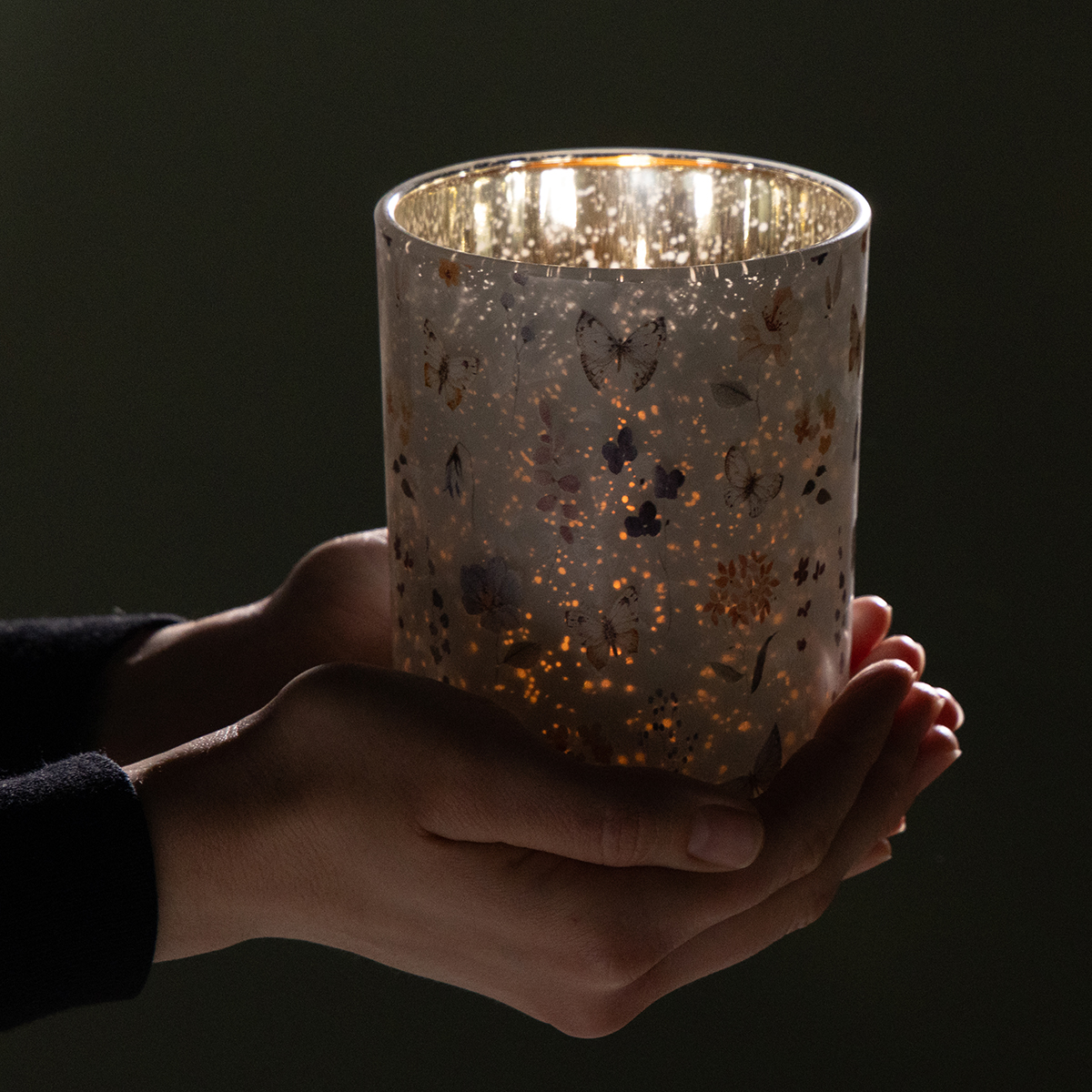 Denna ljusstake är en riktig blickfångare. Med en höjd på 8 cm och en diameter på 7 cm är den precis rätt storlek för att sprida ett mjukt ljus utan att vara överväldigande. Det fina fjärilsmotivet på glaset, i kombination med den invändiga reflekterande silverytan, skapar ett magiskt samspel mellan ljus och skugga när ett ljus tänds inuti. Det ger en touch av elegans till både inomhus- och utomhusutrymmen.