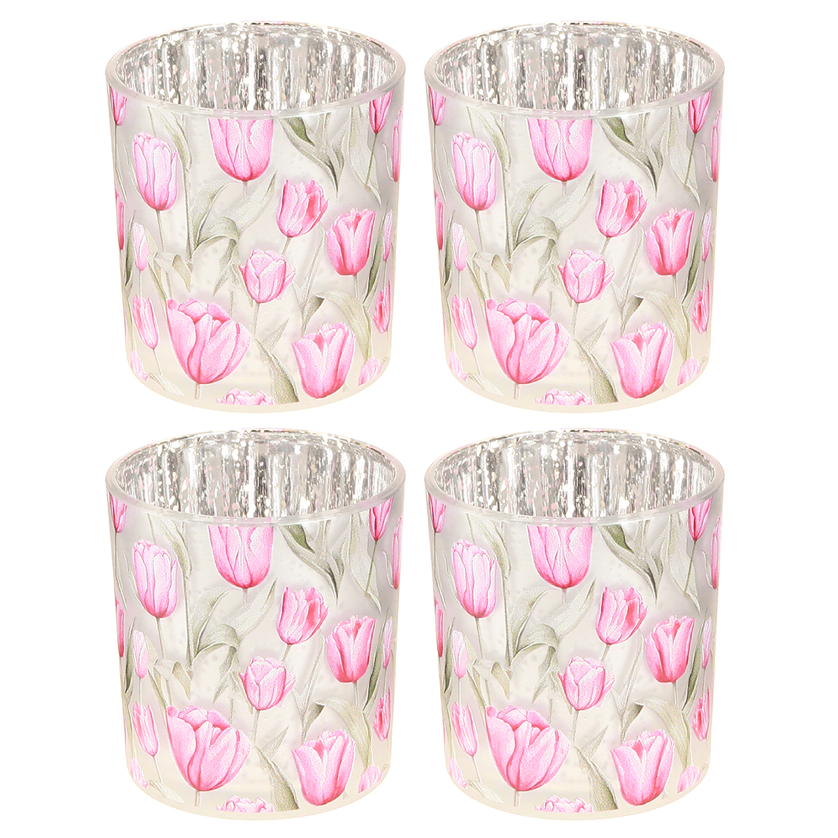 Produktnamn: Dekorativ glaslykta med tulpanmotiv för vårinredning i hemmet, 8 cm, 4 stycken.