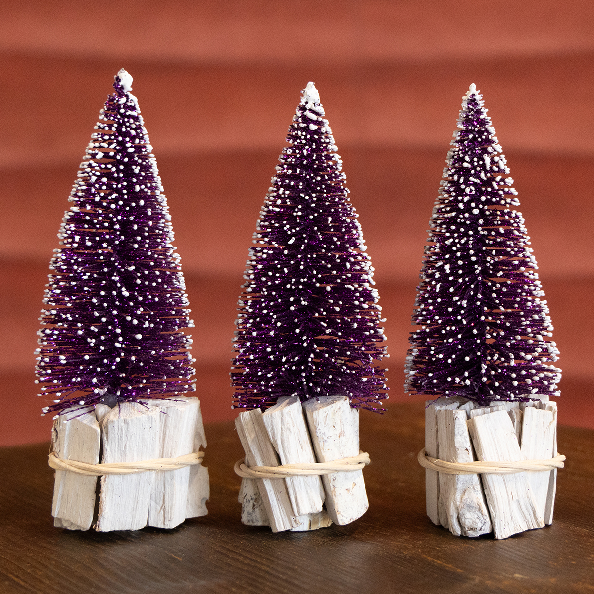 Dekorativ julgran i lila med snötopp på en rustik träfot 15 cm 3 stycken.