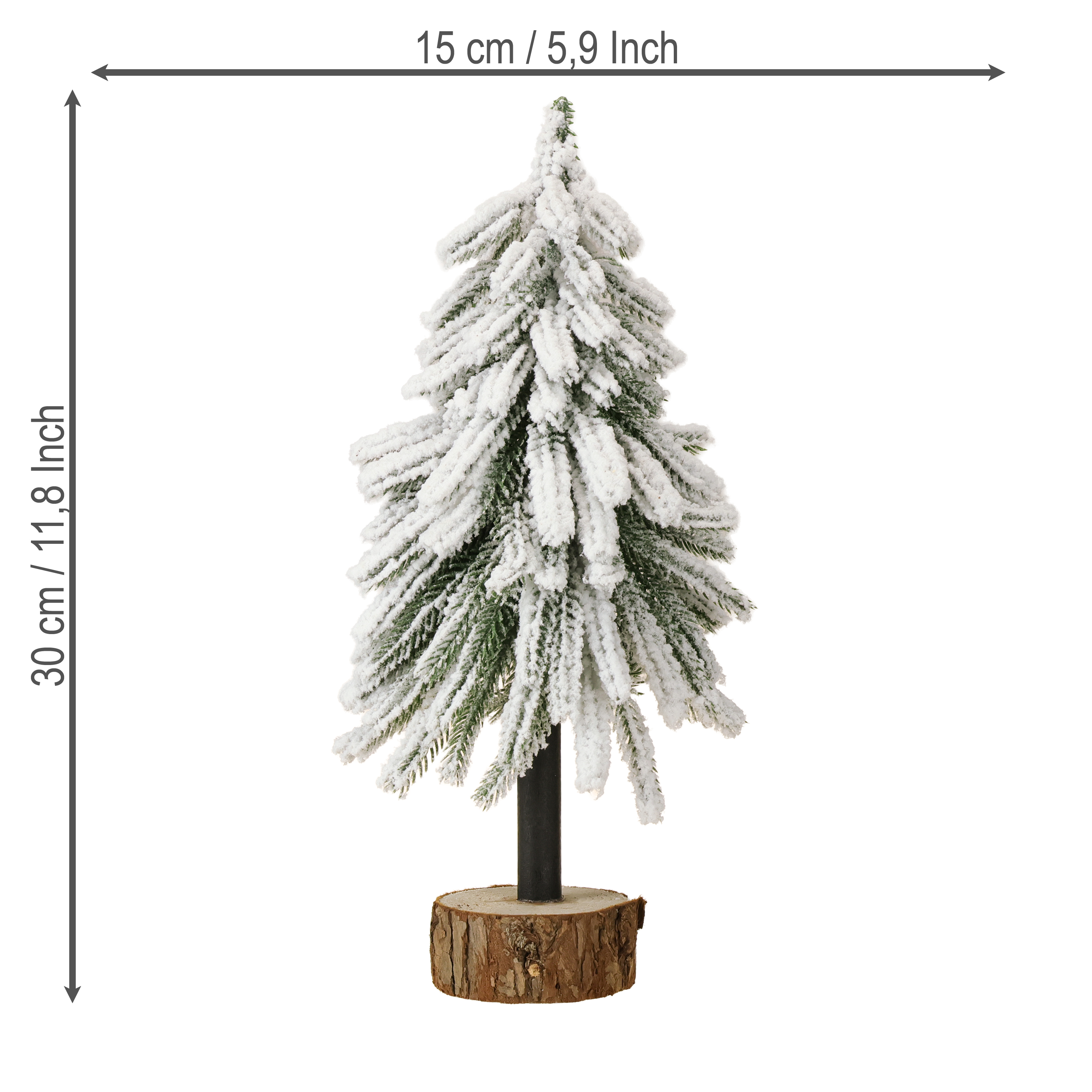 Dekorativ julgran täckt av snö på träfot Ø15cm H30cm