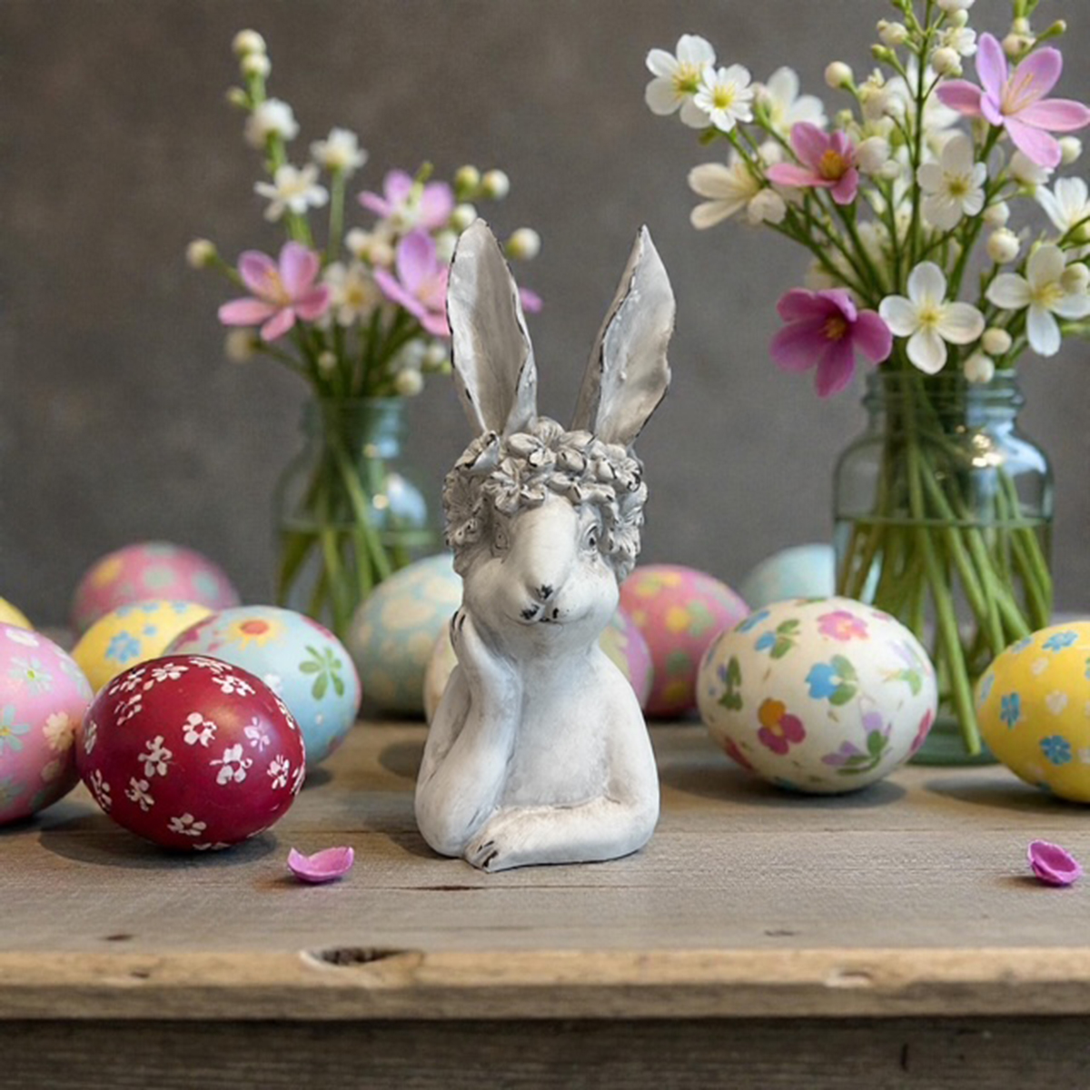 Vår dekorativa kanin imponerar med sitt harmoniska samspel mellan diskret elegans och delikata detaljer. Den uttrycksfulla posen med den stödjande handen och den lekfulla blomsterkransen på huvudet ger denna figur en unik personlighet. Den behagliga grå färgen gör den mångsidig, medan dess högkvalitativa keramiska material säkerställer stabilitet och hållbarhet. Den är lämplig för både inomhus- och täckta utomhusområden.