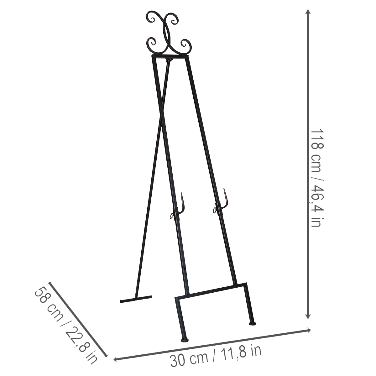 Detta kransställ i svart metall kombinerar elegans och funktionalitet på ett perfekt sätt. Dess robusta konstruktion och enkla men eleganta design gör det till det perfekta tillbehöret för juldekorationer, bröllop eller till och med som en subtil accent i en entré. Med en väl genomtänkt höjd på 118 centimeter drar det uppmärksamheten till dina dekorativa element utan att vara påträngande i sig.
