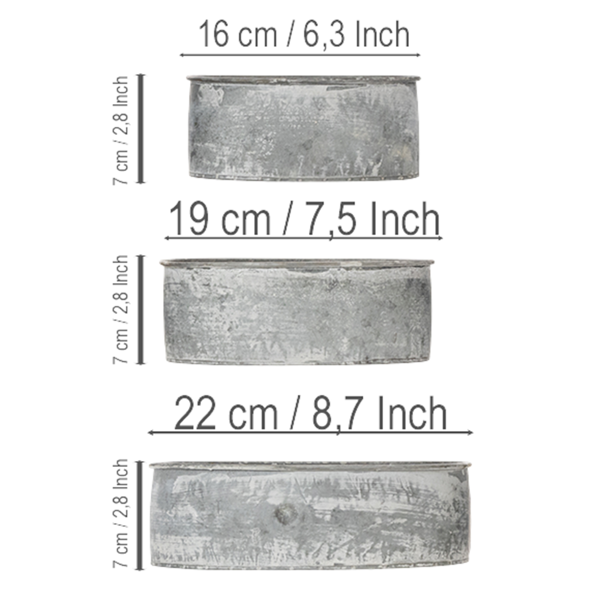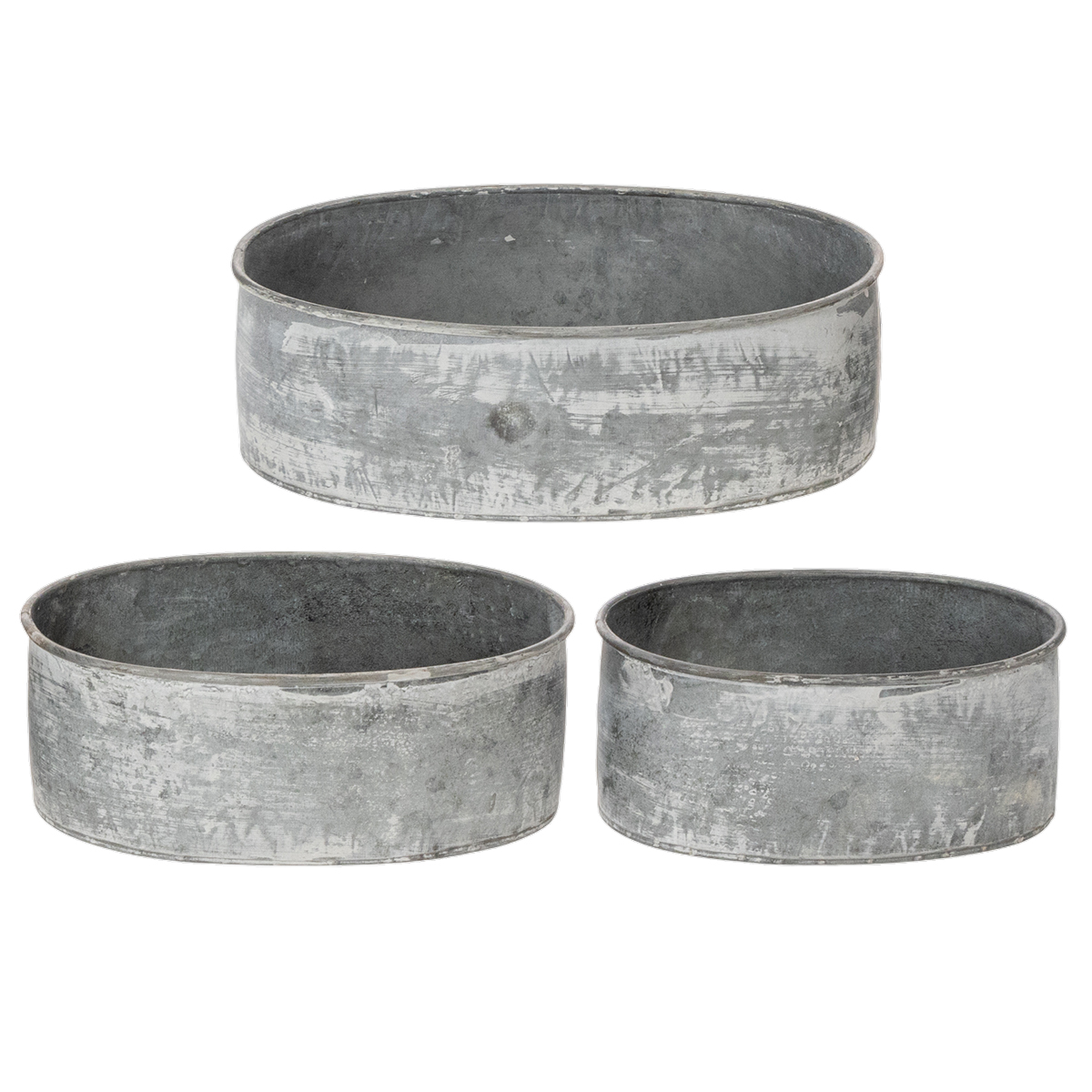 Tvättade i tidlöst grått och vitt kan de tre skålarna användas för både klassiska och vintage-arrangemang. Metallskalen är elegant designade med en rundad kant.