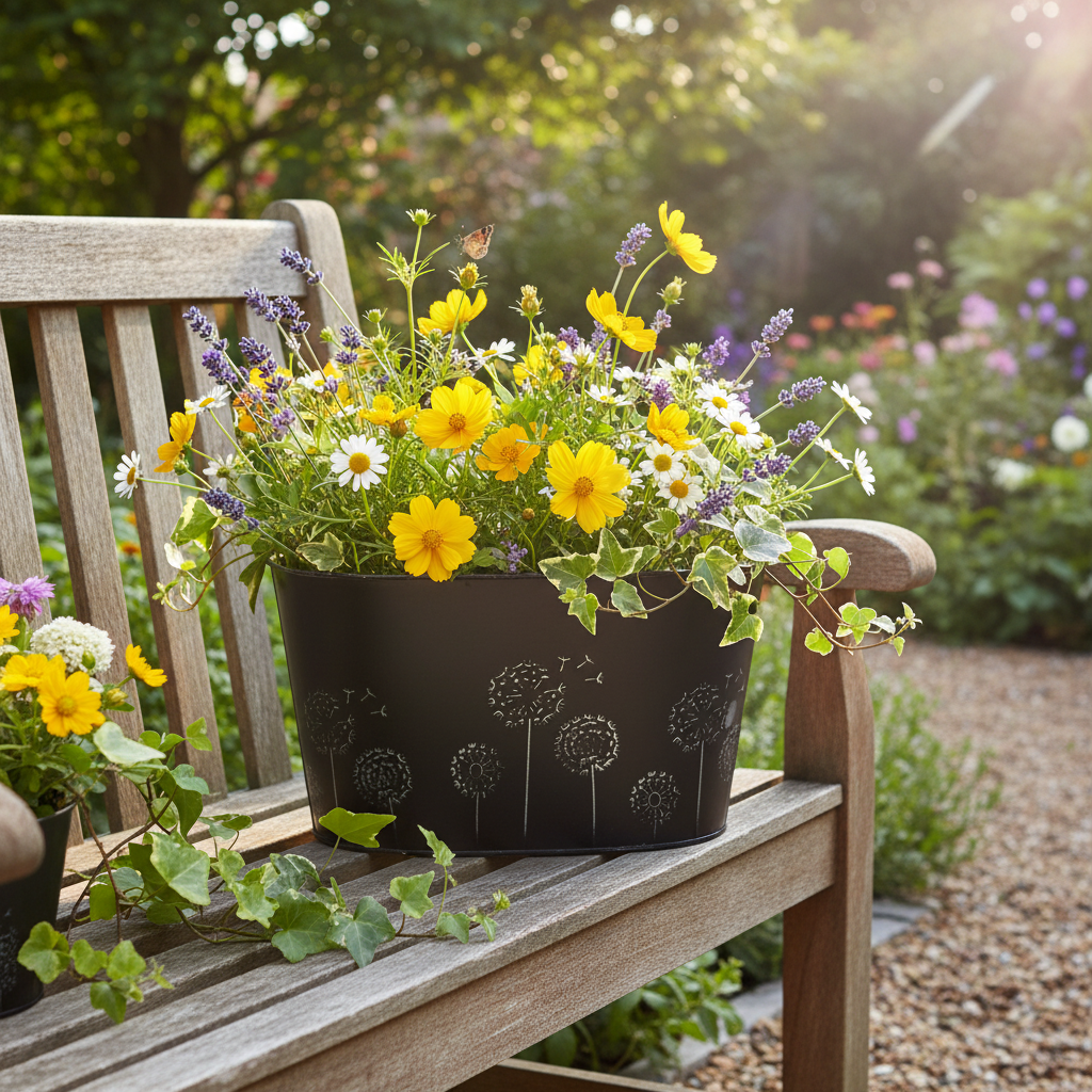 Följ motivet och fyll planteringsbaljan med ängsblommor i lantlig stil. Den eleganta färgblandningen av silver och svart passar även utmärkt till svart och silver påsk eller klassiska bordsdekorationer. Lägg silverpåskägg eller små metallkaniner i skålen som sticker ut ur växtbrickan.