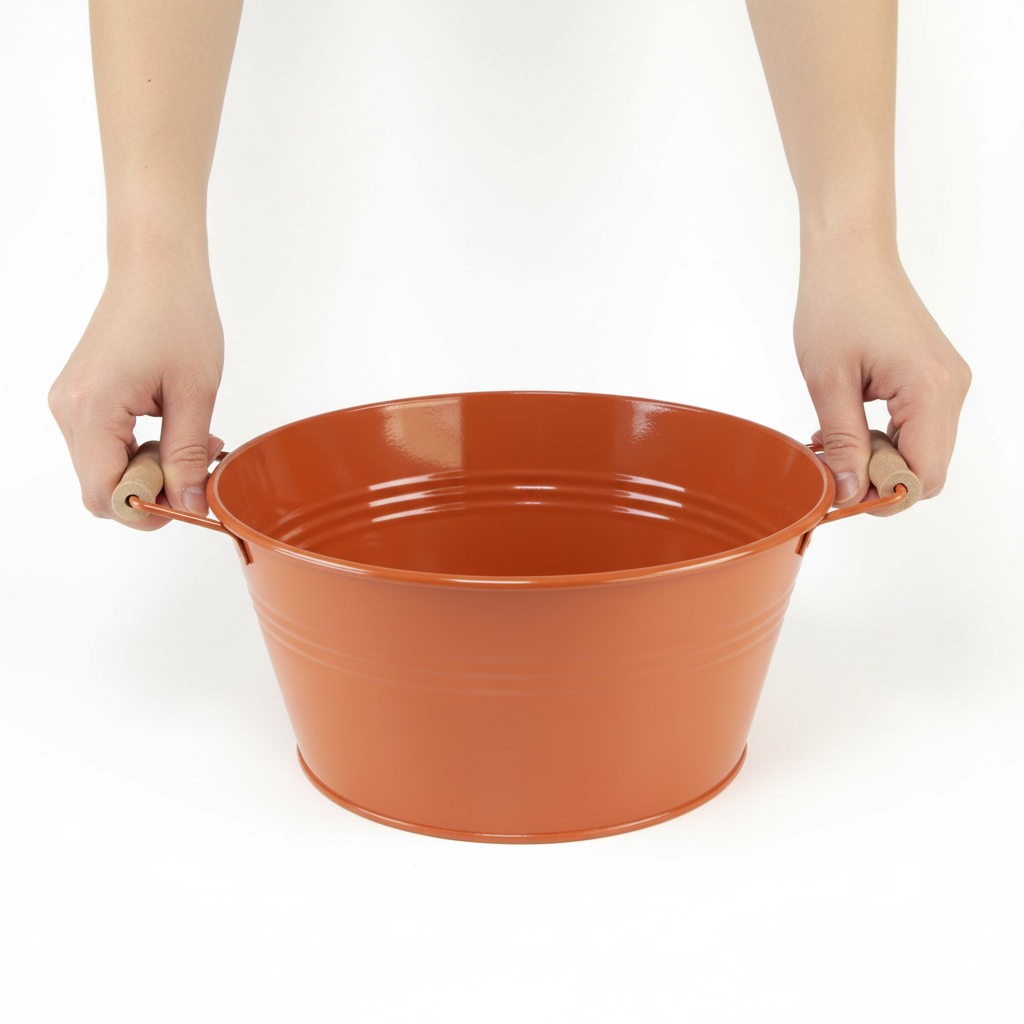 Målad varm och jordfärgad lyser den dekorativa skålen ännu vackrare med gröna växter. Handtagen med svarvade handtag av obehandlat trä är särskilt vackra. Metallskålen ser ut precis som en skål som tidigare användes i hemmet och i jordbruket.