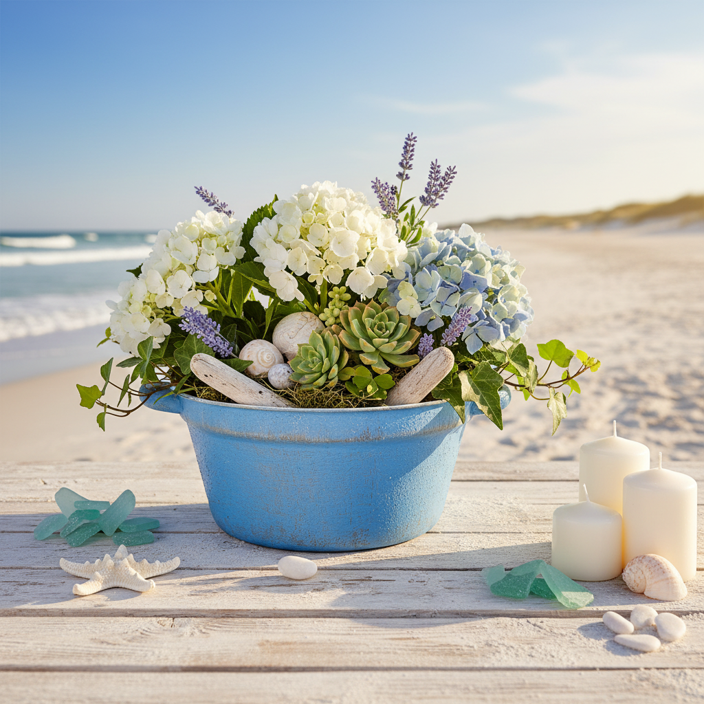 Metalldekorationen ser också vacker ut med dekorativa stenar eller sand och suckulenter. Tack vare färgschemat passar planteringsmaskinen också perfekt in i alla maritima dekorationer. Dekorera skålen med sand, torkade blommor, snäckor och drivved. Så blir metallcachepotten en harmonisk bordsdekoration.