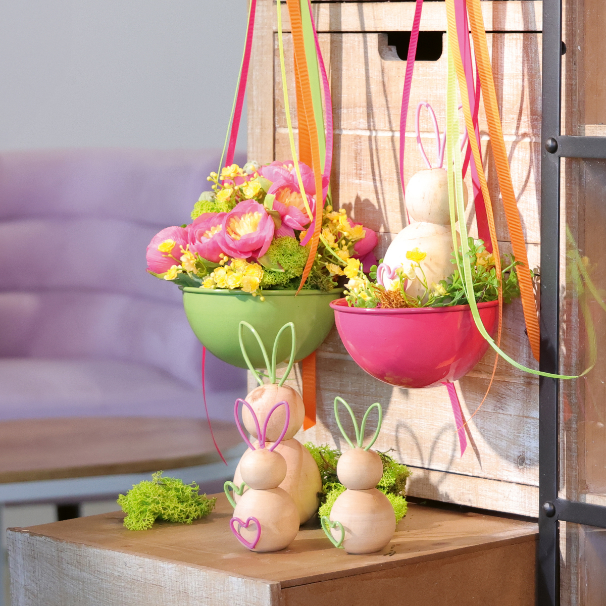 Dessa kaninfigurer i trä är tillverkade av högkvalitativt naturligt trä, vilket ger dem ett enkelt men elegant utseende. Deras rundade kroppar skapar en harmonisk effekt, medan de fina trådöronen i rosa, grönt och gult ger en modern touch. Med en praktisk höjd på 11 cm passar de perfekt in i en mängd olika dekorationsstilar: oavsett om det är för klassiska påskbordsdekorationer, som en höjdpunkt på fönsterbrädan eller för en modern vintage-påskdekoration – möjligheterna är lika mångsidiga som deras ägares fantasi. Föredrar du en minimalistisk stil? Kombinera då träkaninerna med några färska tulpaner eller fina grenar! För en mer lekfull look kan de vackert arrangeras med färgglada påskägg eller små lampor. Tack vare sin neutrala träfärg smälter figurerna sömlöst in i alla inredningsstilar – skandinavisk, rustik eller modern. Helt enkelt underbart!
