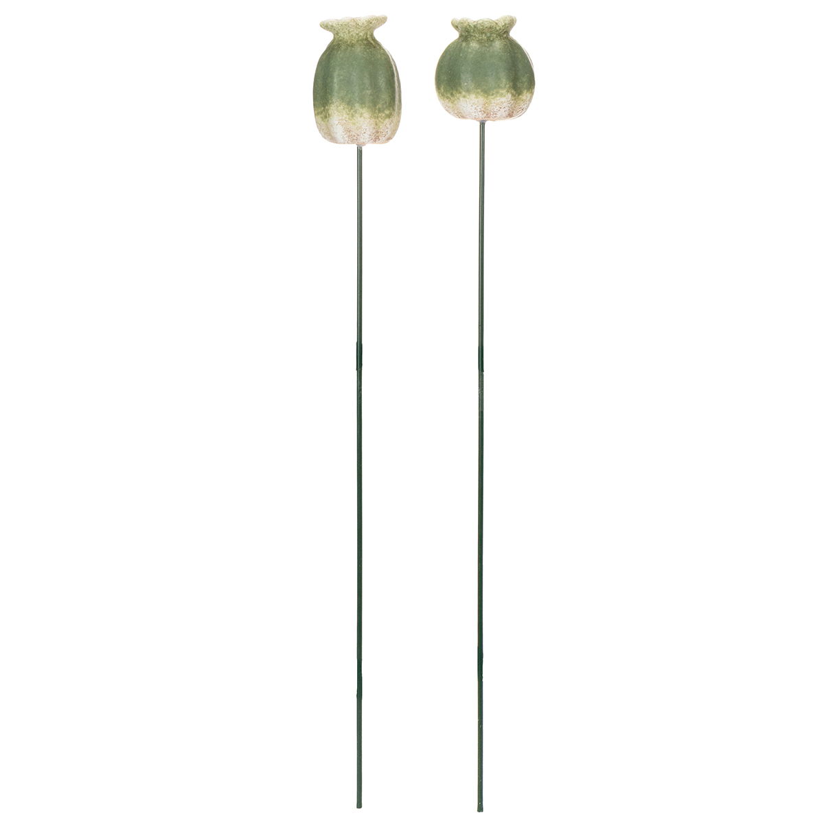 Dessa dekorativa vallmofrökapslar på pålar ger enkelt en elegant och tidlös touch till din utomhusmiljö. Kanske är dina krukor redan vackert arrangerade och bara behöver den sista touchen – dessa vallmofrökapslar är den perfekta finishen. Med sin naturliga gröna färg och fint texturerade finish smälter dessa trädgårdspålar sömlöst in i alla miljöer. Oavsett om de arrangeras i rabatter, används för att dekorera krukor eller till och med som gångmarkörer, kommer de garanterat att fånga blickarna och skapa en lugn och harmonisk atmosfär. Kombinationen av keramik och det handgjorda utseendet på ytans textur gör dem särskilt autentiska. Det är de små detaljerna som gör dem så charmiga!