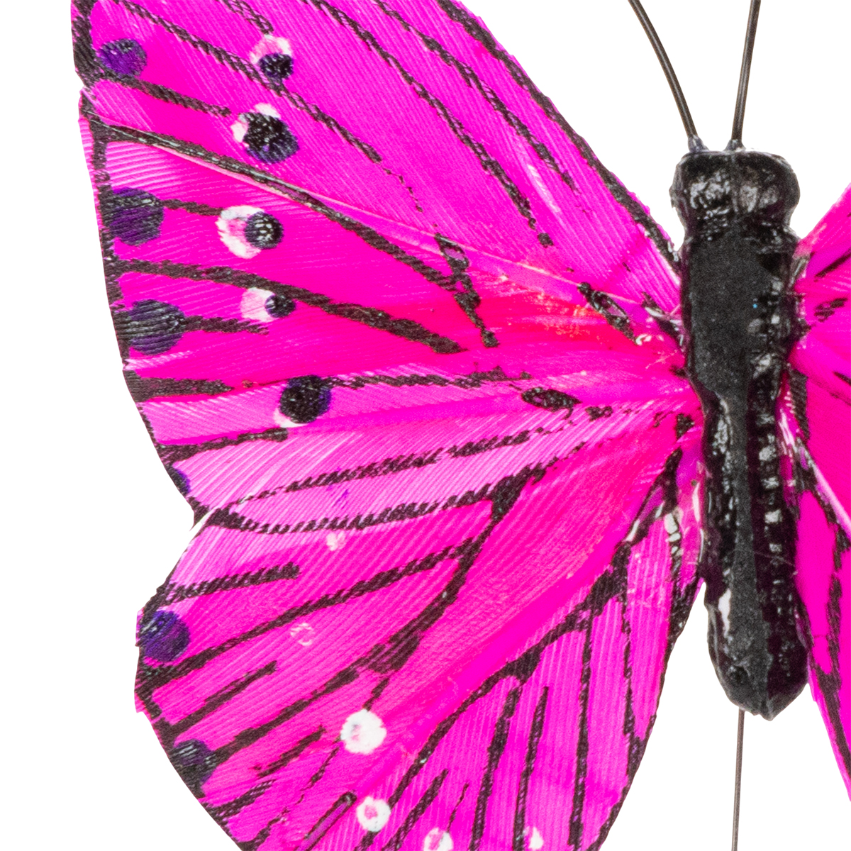 Setet erbjuder ett särskilt varierat utbud av färger. Från delikat krämfärg till glad orange och slående rosa, varje färg är en liten höjdpunkt. Det riktiga fjädermaterialet ger fjärilarna en extra touch av naturlighet. Tråden som är fäst vid varje fjäril har en totalhöjd på 24 cm – perfekt för att integrera fjärilarna i blomsterarrangemang eller placera dem som svävande dekorationer på ett bord.