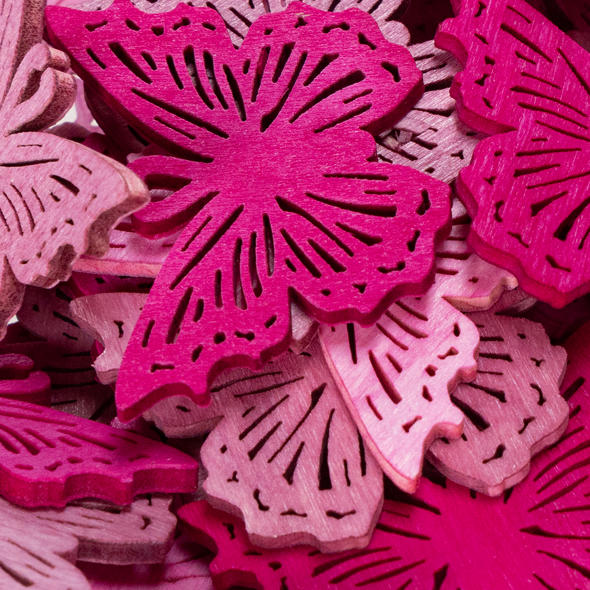 Dessa fjärilsdekorationer, tillverkade av fint trä, är 4 cm stora och kommer i ett praktiskt paket om 72. Detta räcker för att dekorera flera bord, skålar eller till och med större skyltfönster. Färgschemat i rosa, rosé och lila är subtilt och vårigt – ett riktigt blickfång som varken är grällt eller tråkigt. De som föredrar ett mer naturligt utseende kommer att älska det fint ådrade träet och den delikata designen på vingarna. Fjärilarna passar särskilt väl in i moderna och klassiska inredningsstilar, men fungerar också vackert i shabby chic- eller lantlig stil.