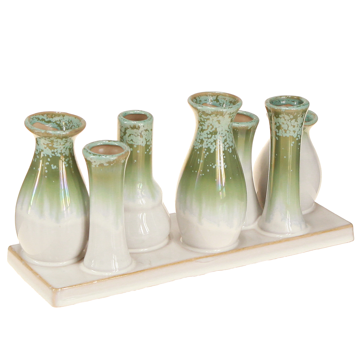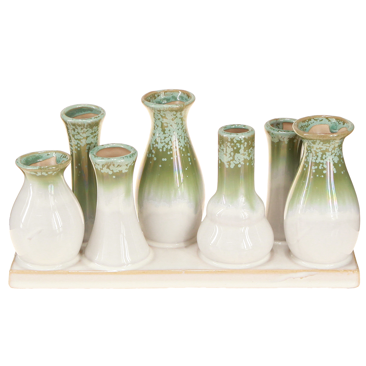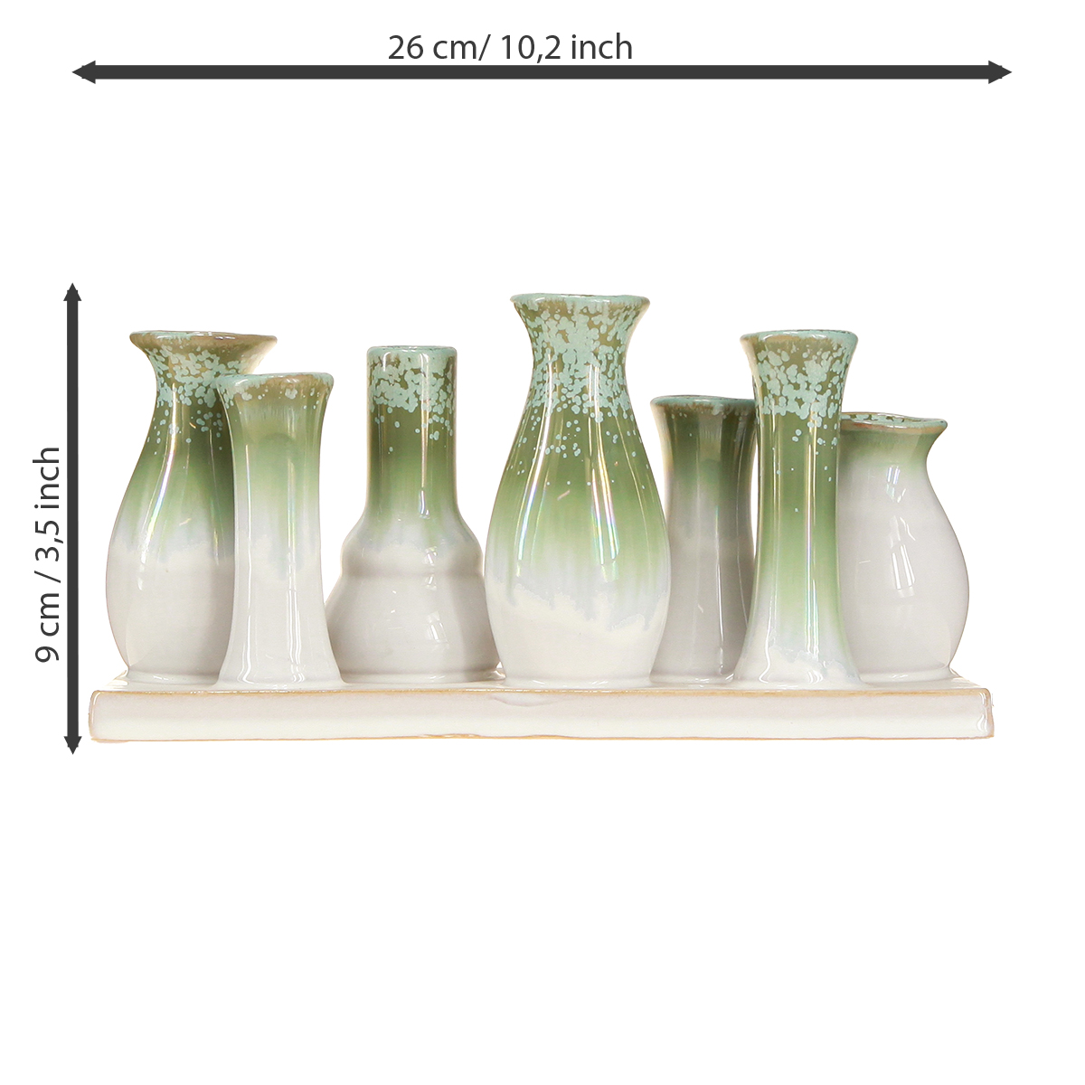 Denna uppsättning med sju små dekorativa keramiska vaser på ett färgmatchat fat kommer snabbt att bli en höjdpunkt i din inredning. De harmoniska gröna och vita tonerna framkallar den naturliga skandinaviska designen och kompletterar minimalistiska eller rustika stilar perfekt. Vaserna är formade på olika sätt, vilket ger en visuell inverkan på den krämfärgade färgen. Oavsett om de arrangeras som en grupp eller placeras individuellt, erbjuder denna uppsättning otaliga designmöjligheter.