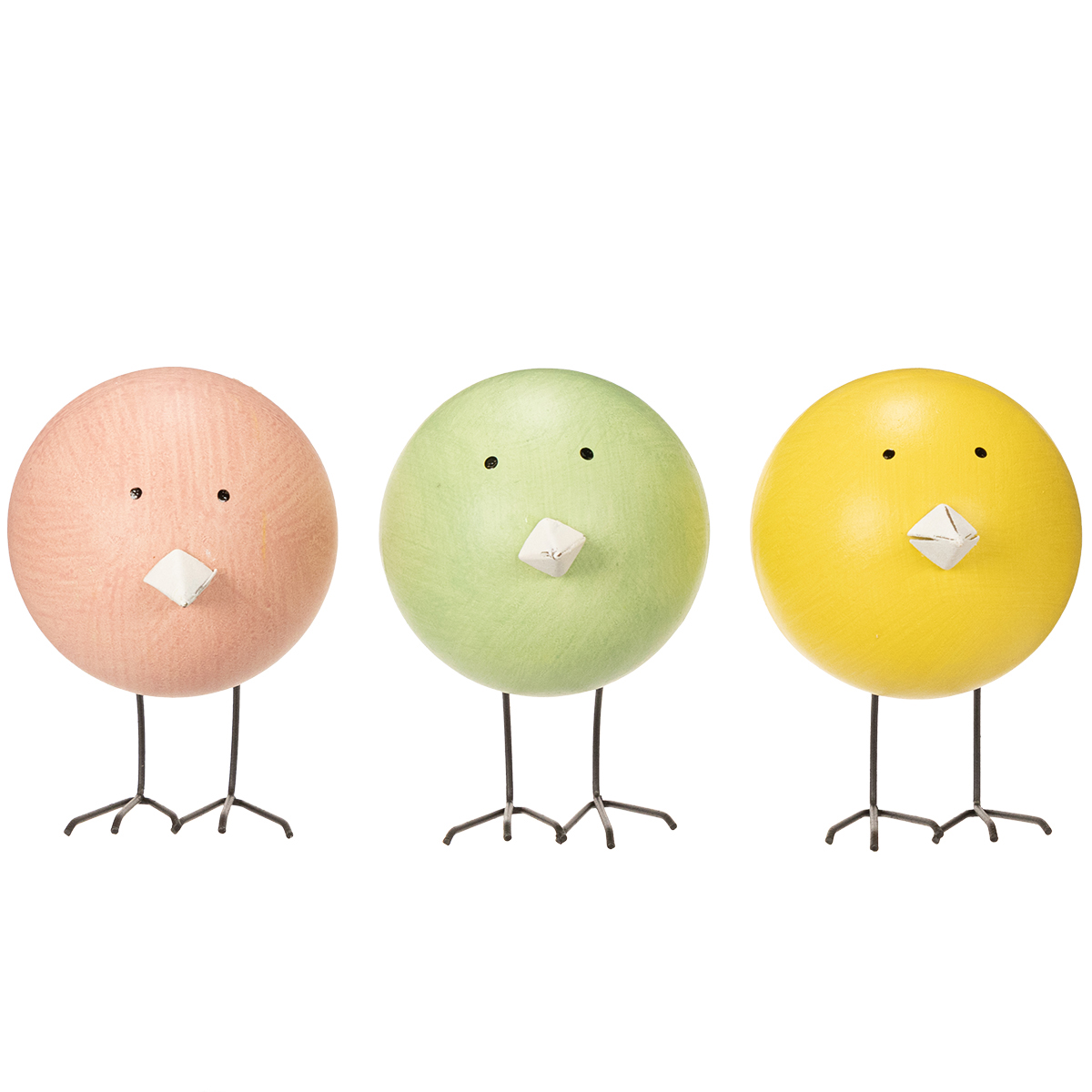 Detta set består av tre kycklingar i gult, rosa och grönt. Deras lätt glansiga yta ger en touch av livfullhet utan att vara överväldigande. Med en höjd på 9,5 cm och en diameter på 8,5 cm är de tillräckligt kompakta för flexibel uppställning – oavsett om de är på hyllor, byråer eller direkt på bordet. De glada färgerna är särskilt harmoniska och kombineras vackert med andra vår- eller påskdekorationer. För en elegant och naturlig look kan dessa kycklingar till och med kombineras med fina blomsterarrangemang eller andra träföremål. En riktig allround-dekoration för din inredning!