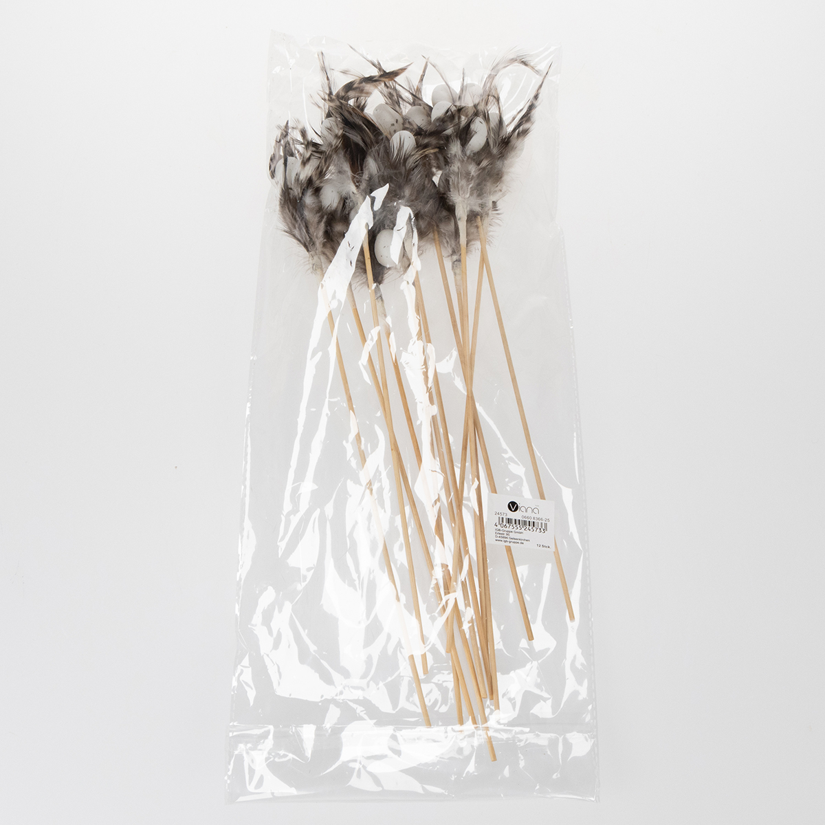 - Material: Träpinne med naturliga fjädrar och små plastägg